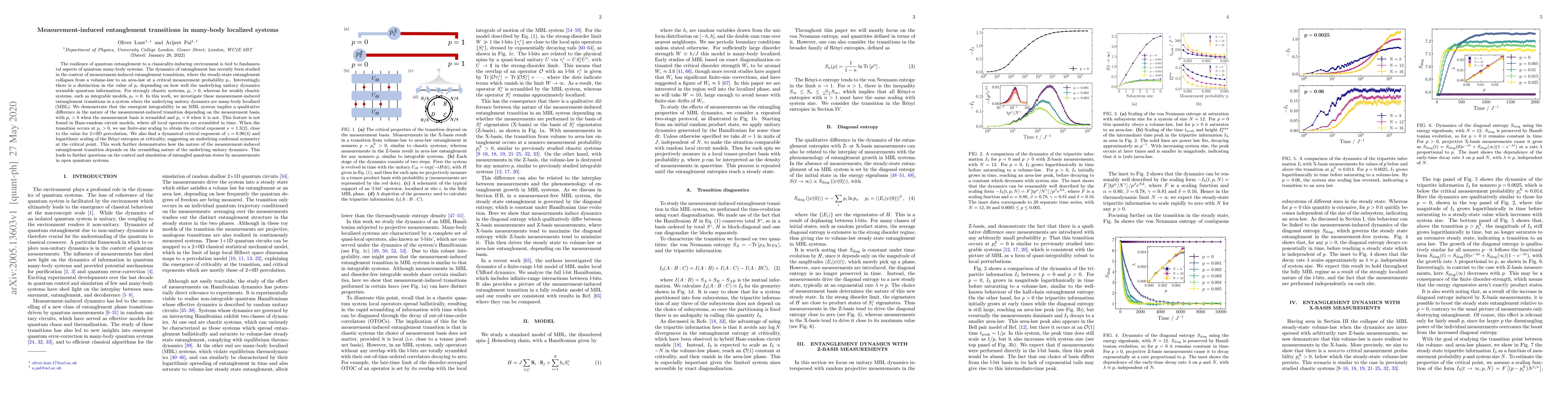 This paper explores measurement-induced entanglement transitions in many-body localized systems, showing that the critical measurement probability $p_{c}$ varies based on the scrambling nature of the underlying unitary dynamics. The study reveals a qualitative difference in the transition's nature depending on the measurement basis, with implications for the dynamics and control of entangled quantum states in open quantum systems.