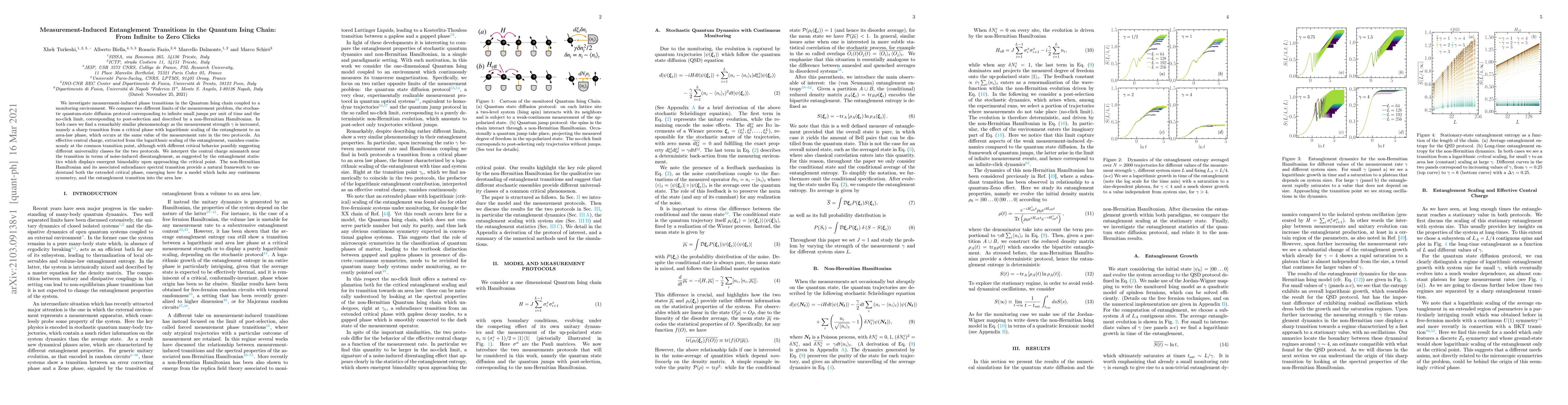 This paper explores measurement-induced phase transitions in the Quantum Ising chain, comparing two measurement limits: infinite small jumps and no-click post-selection. Both show a transition from a critical phase with logarithmic entanglement scaling to an area-law phase, suggesting similar phenomenology despite different protocols.