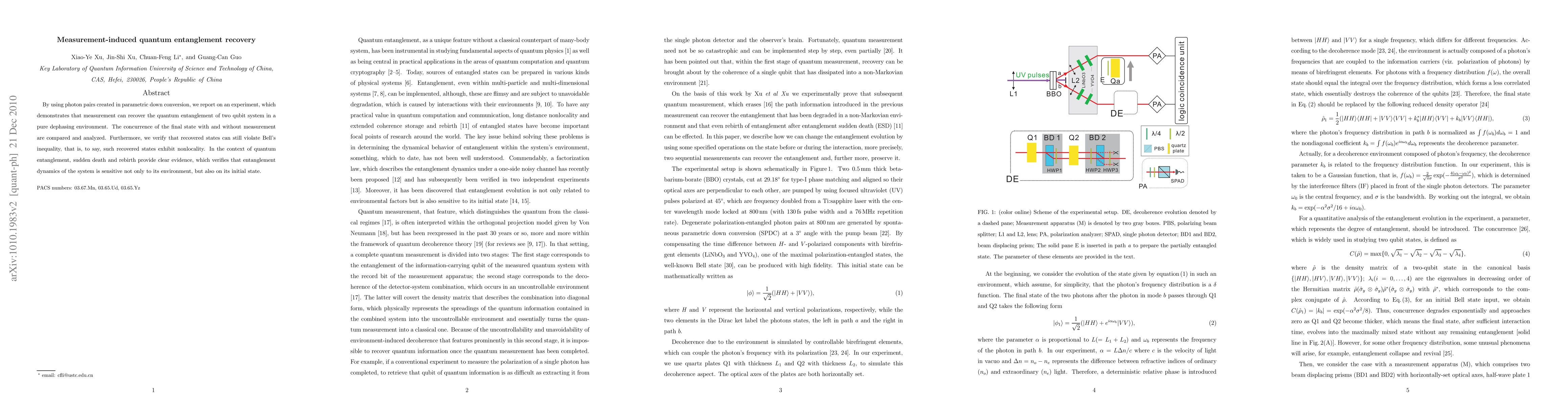 This paper demonstrates an experiment showing that measurement can recover quantum entanglement in a pure dephasing environment using photon pairs from parametric down conversion. The experiment verifies that recovered states maintain nonlocality by violating Bell's inequality, highlighting the sensitivity of entanglement dynamics to both environment and initial state.