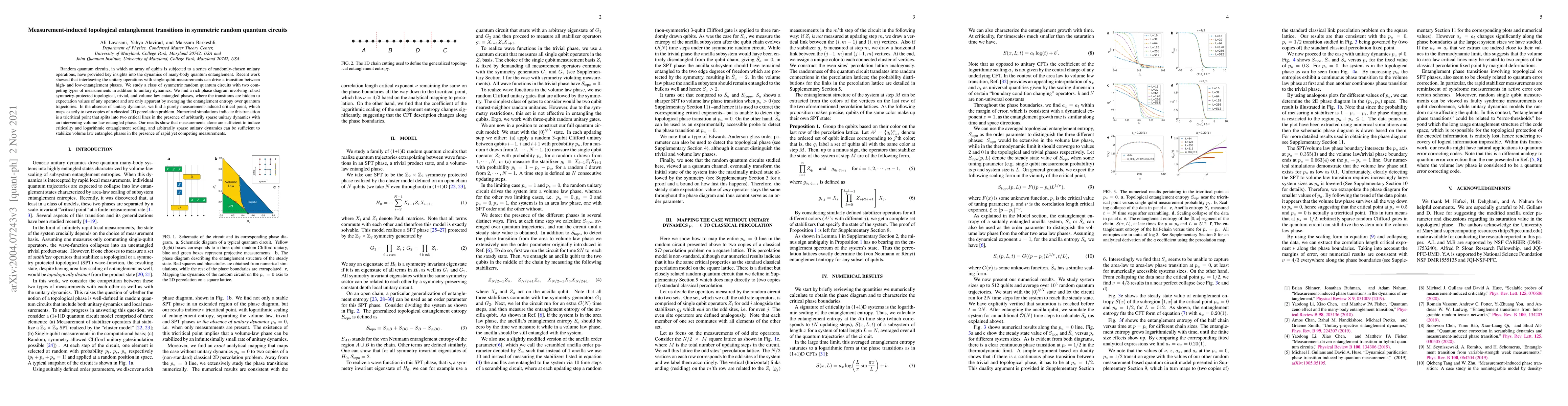 This research investigates symmetric random quantum circuits with competing measurement types, revealing a phase diagram of topological, trivial, and volume law entangled states. The study finds a measurement-induced critical point with logarithmic entanglement scaling, mapping exactly to a classical percolation problem, and shows that sparse unitary dynamics can stabilize volume law phases amidst competing rapid measurements.