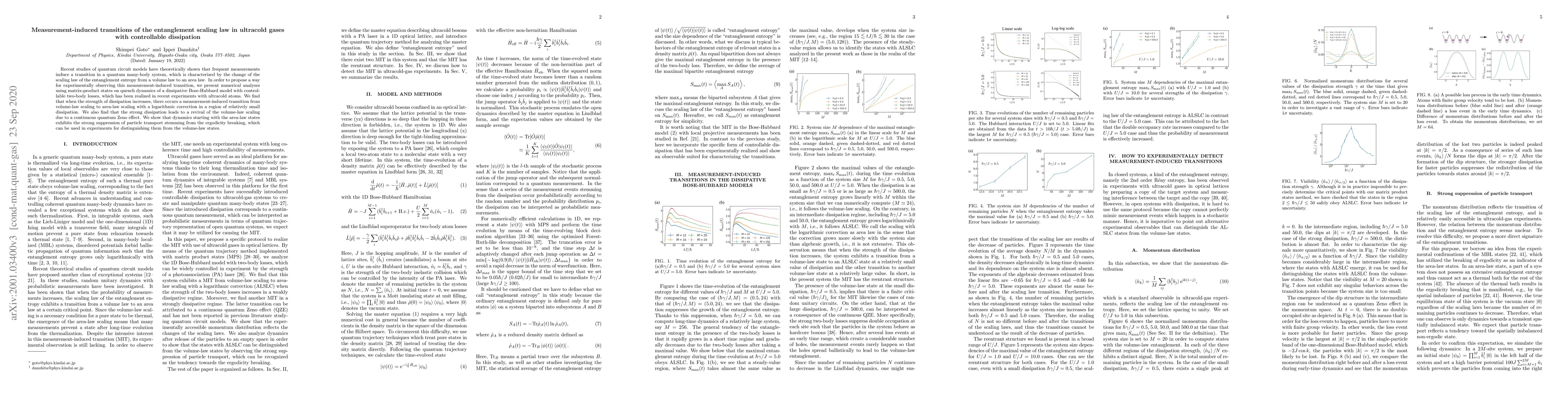 Recent studies of quantum circuit models have theoretically shown that frequent measurements induce a transition in a quantum many-body system, which is characterized by the change of the scaling law of the entanglement entropy from a volume law to an area law. In order to propose a way for experimentally observing this measurement-induced transition, we present numerical analyses using matrix-product states on quench dynamics of a dissipative Bose-Hubbard model with controllable two-body losses, which has been realized in recent experiments with ultracold atoms. We find that when the strength of dissipation increases, there occurs a measurement-induced transition from volume-law scaling to area-law scaling with a logarithmic correction in a region of relatively small dissipation. We also find that the strong dissipation leads to a revival of the volume-law scaling due to a continuous quantum Zeno effect. We show that dynamics starting with the area-law states exhibits the breaking of ergodicity, which can be used in experiments for distinguishing them from the volume-law states.
