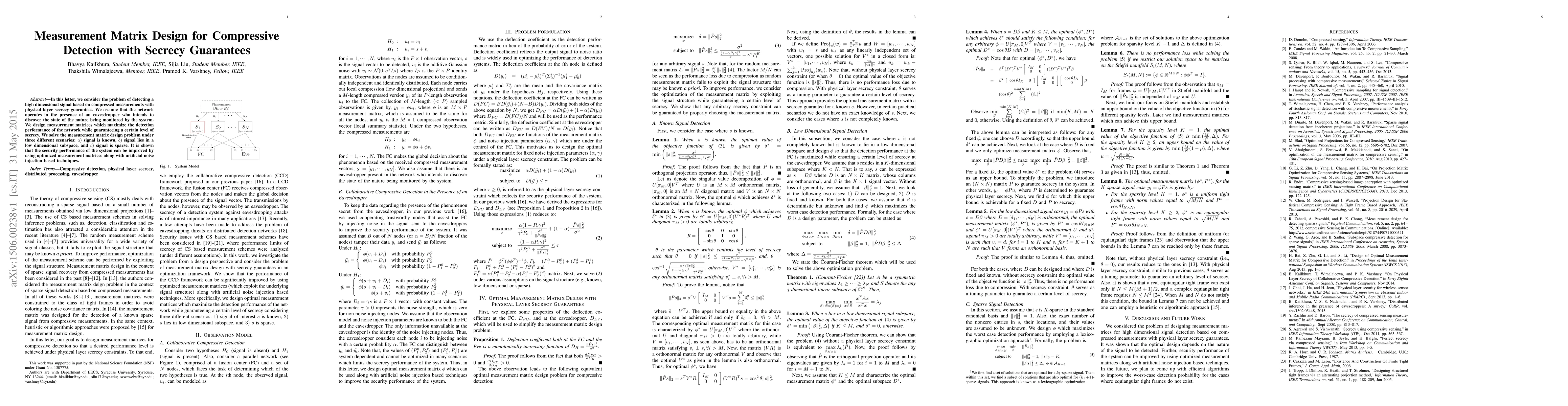 In this letter, we consider the problem of detecting a high dimensional signal based on compressed measurements with physical layer secrecy guarantees. We assume that the network operates in the presence of an eavesdropper who intends to discover the state of the nature being monitored by the system. We design measurement matrices which maximize the detection performance of the network while guaranteeing a certain level of secrecy. We solve the measurement matrix design problem under three different scenarios: $a)$ signal is known, $b)$ signal lies in a low dimensional subspace, and $c)$ signal is sparse. It is shown that the security performance of the system can be improved by using optimized measurement matrices along with artificial noise injection based techniques.