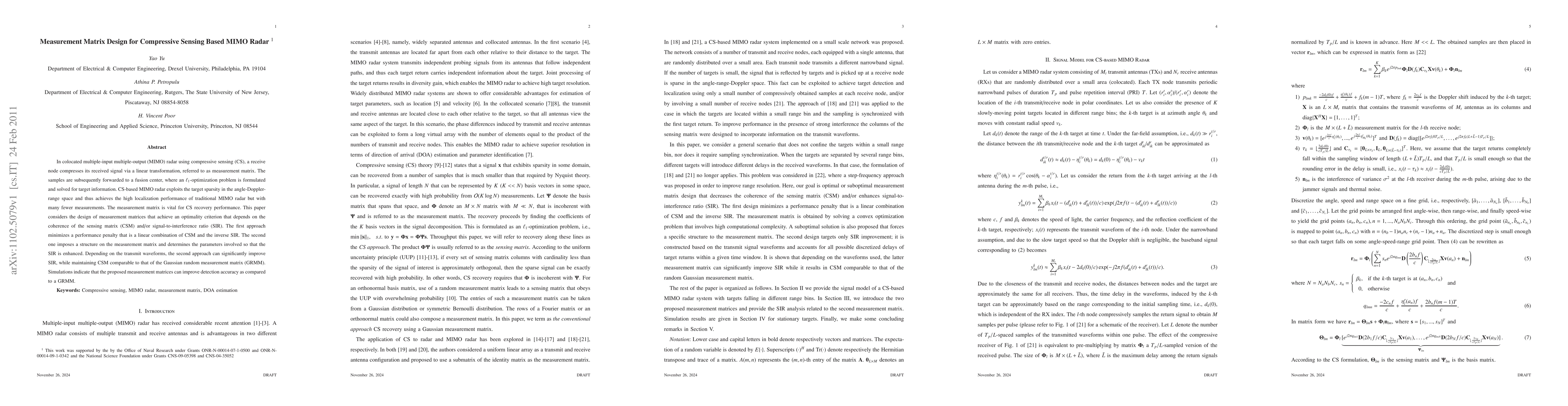 This paper proposes new measurement matrix designs for compressive sensing-based MIMO radar to enhance recovery performance. The approaches aim to minimize a performance penalty and enhance the signal-to-interference ratio, showing improved detection accuracy over Gaussian random measurement matrices in simulations.