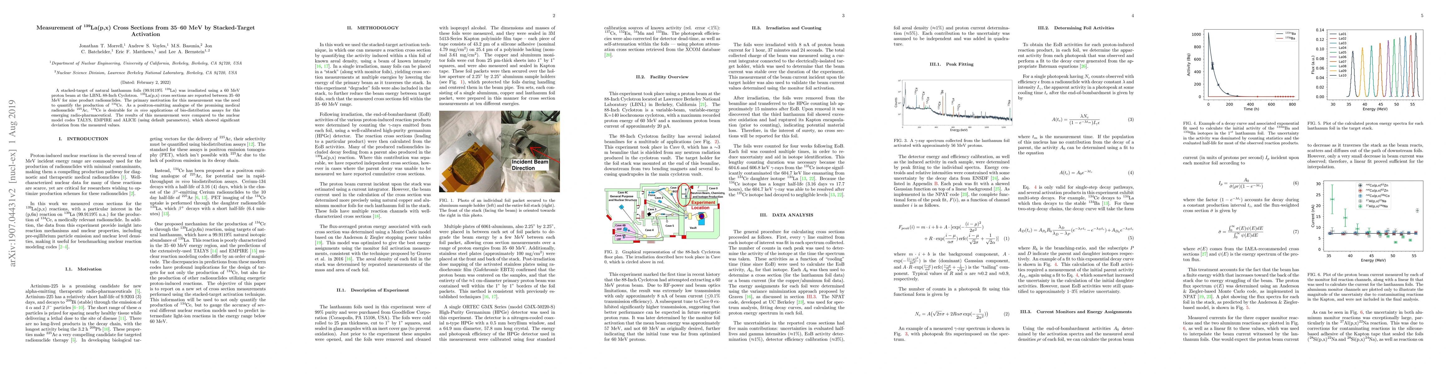 A stacked-target of natural lanthanum foils (99.9119% $^{139}$La) was irradiated using a 60 MeV proton beam at the LBNL 88-Inch Cyclotron. $^{139}$La(p,x) cross sections are reported between 35-60 MeV for nine radionuclides. The primary motivation for this measurement was the need to quantify the production of $^{134}$Ce. As a positron-emitting analogue of the promising medical radionuclide $^{225}$Ac, $^{134}$Ce is desirable for in vivo applications of bio-distribution assays for this emerging radio-pharmaceutical. The results of this measurement were compared to the nuclear model codes TALYS, EMPIRE and ALICE (using default parameters), which showed significant deviation from the measured values.