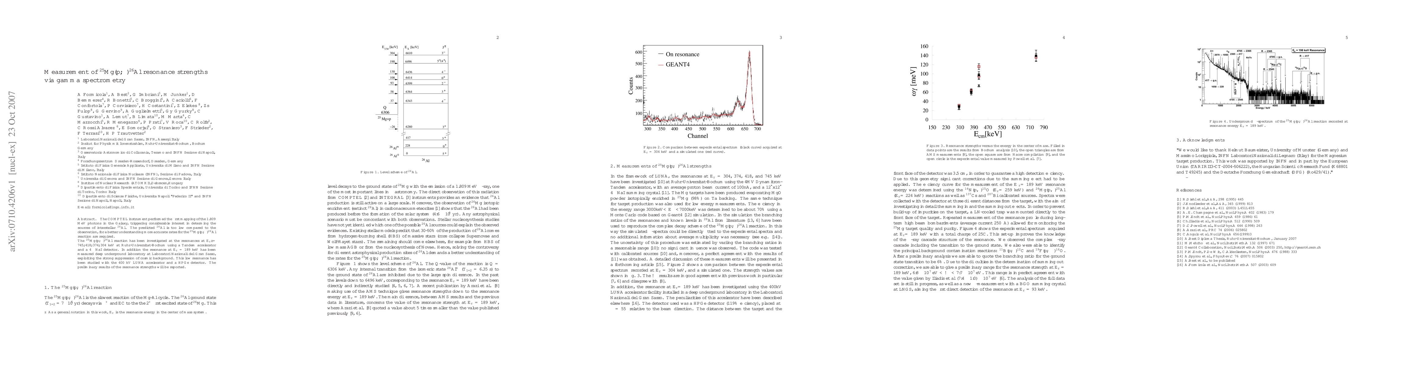The COMPTEL instrument performed the first mapping of the 1.809 MeV photons in the Galaxy, triggering considerable interest in determing the sources of interstellar 26Al. The predicted 26Al is too low compared to the observation, for a better understanding more accurate rates for the 25Mg(p; gamma)26Al reaction are required. The 25Mg(p;gamma)26Al reaction has been investigated at the resonances at Er= 745; 418; 374; 304 keV at Ruhr-Universitat-Bochum using a Tandem accelerator and a 4piNaI detector. In addition the resonance at Er = 189 keV has been measured deep underground laboratory at Laboratori Nazionali del Gran Sasso, exploiting the strong suppression of cosmic background. This low resonance has been studied with the 400 kV LUNA accelerator and a HPGe detector. The preliminary results of the resonance strengths will be reported.