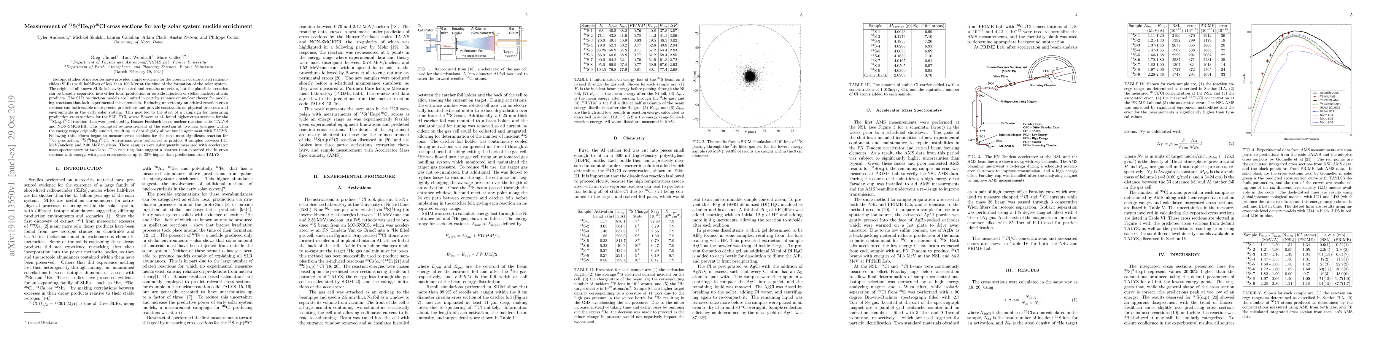 Isotopic studies of meteorites have provided ample evidence for the presence of short-lived radionuclides (SLRs) with half-lives of less than 100 Myr at the time of the formation of the solar system. The origins of all known SLRs is heavily debated and remains uncertain, but the plausible scenarios can be broadly separated into either local production or outside injection of stellar nucleosynthesis products. The SLR production models are limited in part by reliance on nuclear theory for modeling reactions that lack experimental measurements. Reducing uncertainty on critical reaction cross sections can both enable more precise predictions and provide constraints on physical processes and environments in the early solar system. This goal led to the start of a campaign for measuring production cross sections for the SLR $^{36}$Cl, where Bowers et al. found higher cross sections for the ${}^{33}$S($\alpha$,p)$^{36}$Cl reaction than were predicted by Hauser-Feshbach based nuclear reaction codes TALYS and NON-SMOKER. This prompted re-measurement of the reaction at five new energies within the energy range originally studied, resulting in data slightly above but in agreement with TALYS. Following this, efforts began to measure cross sections for the next most significant reaction for $^{36}$Cl production, $^{34}$S($^{3}$He,p)$^{36}$Cl. Activations were performed to produce 9 samples between 1.11 MeV/nucleon and 2.36 MeV/nucleon. These samples were subsequently measured with accelerator mass spectrometry at two labs. The resulting data suggest a sharper-than-expected rise in cross sections with energy, with peak cross sections up to 30\% higher than predictions from TALYS.