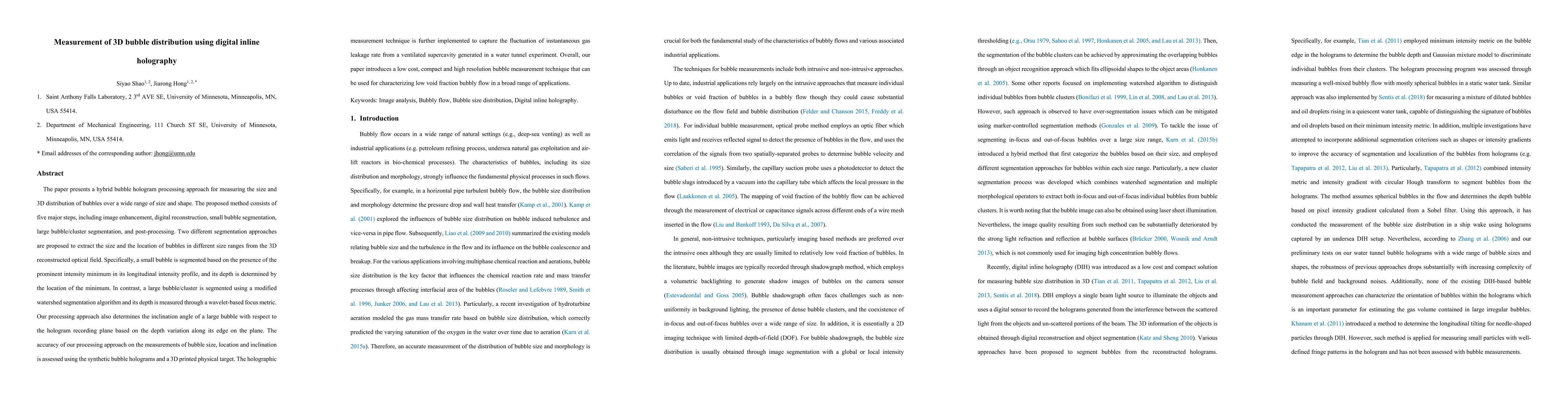 This paper introduces a hybrid digital inline holography method for measuring the 3D size and distribution of bubbles, employing a five-step processing approach including segmentation techniques for small and large bubbles. The method's accuracy is validated through synthetic and physical targets, demonstrating its potential for characterizing bubbly flows in various applications.