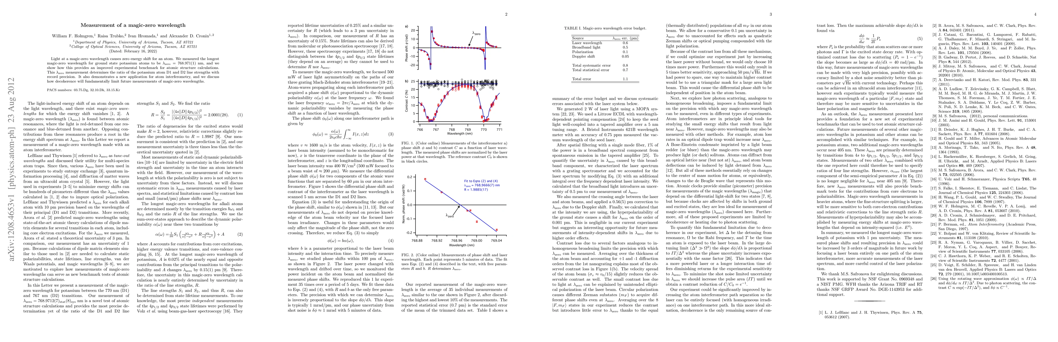 Light at a magic-zero wavelength causes zero energy shift for an atom. We measured the longest magic-zero wavelength for ground state potassium atoms to be $\lambda_\textrm{zero}=768.971(1)$ nm, and we show how this provides an improved experimental benchmark for atomic structure calculations. This $\lambda_\textrm{zero}$ measurement determines the ratio of the potassium atom D1 and D2 line strengths with record precision. It also demonstrates a new application for atom interferometry, and we discuss how decoherence will fundamentally limit future measurements of magic-zero wavelengths.