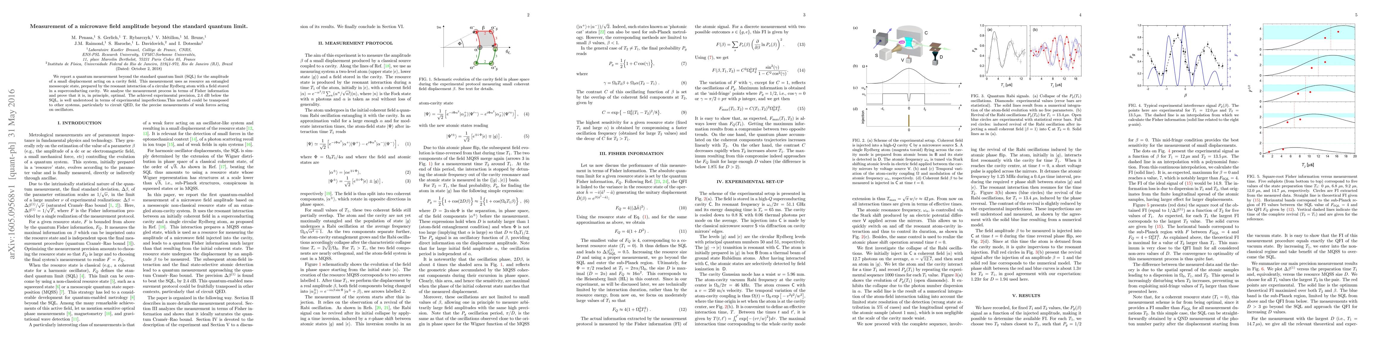 We report a quantum measurement beyond the standard quantum limit (SQL) for the amplitude of a small displacement acting on a cavity field. This measurement uses as resource an entangled mesoscopic state, prepared by the resonant interaction of a circular Rydberg atom with a field stored in a superconducting cavity. We analyse the measurement process in terms of Fisher information and prove that it is, in principle, optimal. The achieved experimental precision, 2.4 dB below the SQL, is well understood in terms of experimental imperfections.This method could be transposed to other systems, particularly to circuit QED, for the precise measurements of weak forces acting on oscillators.