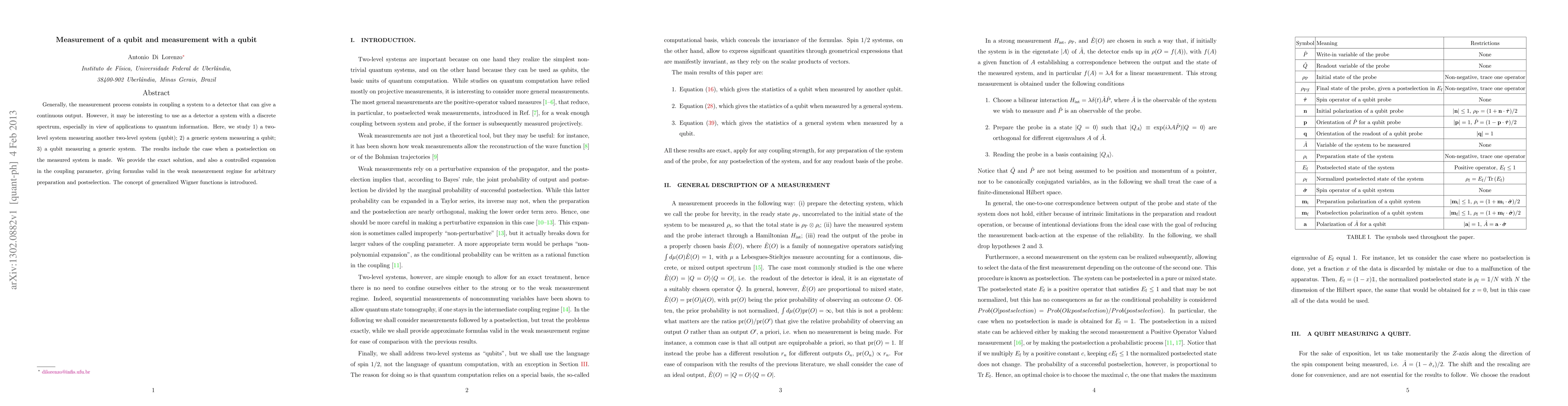 Generally, the measurement process consists in coupling a system to a detector that can give a continuous output. However, it may be interesting to use as a detector a system with a discrete spectrum, especially in view of applications to quantum information. Here, we study 1) a two-level system measuring another two-level system (qubit); 2) a generic system measuring a qubit; 3) a qubit measuring a generic system. The results include the case when a postselection on the measured system is made. We provide the exact solution, and also a controlled expansion in the coupling parameter, giving formulas valid in the weak measurement regime for arbitrary preparation and postselection. The concept of generalized Wigner functions is introduced.