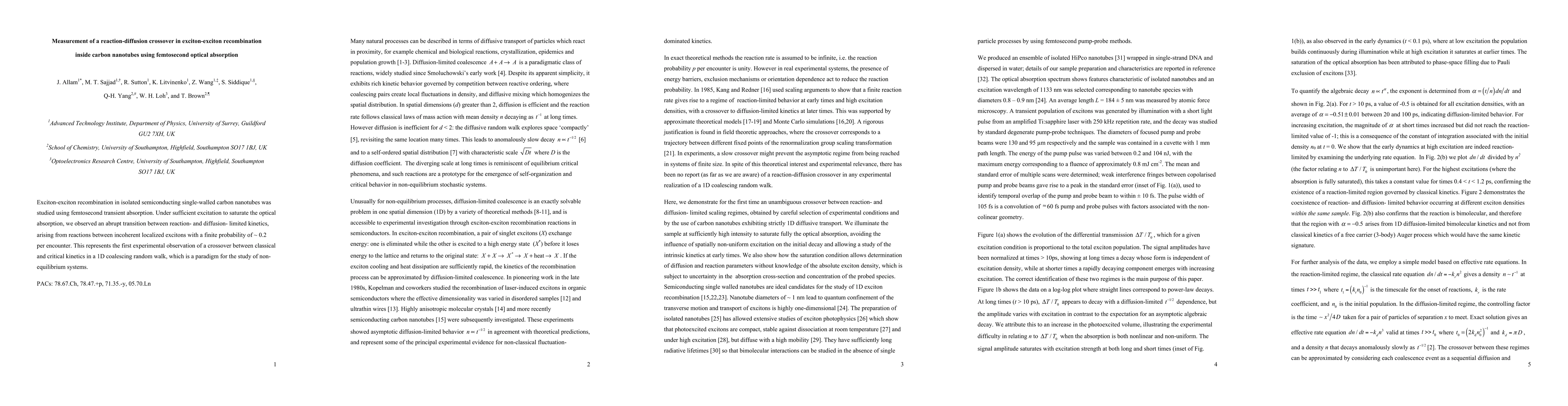 This paper reports the first experimental observation of a reaction-diffusion crossover in exciton-exciton recombination within carbon nanotubes using femtosecond optical absorption, revealing a transition between reaction- and diffusion-limited kinetics under high excitation conditions. The study highlights a critical kinetics phenomenon in a one-dimensional coalescing random walk system.