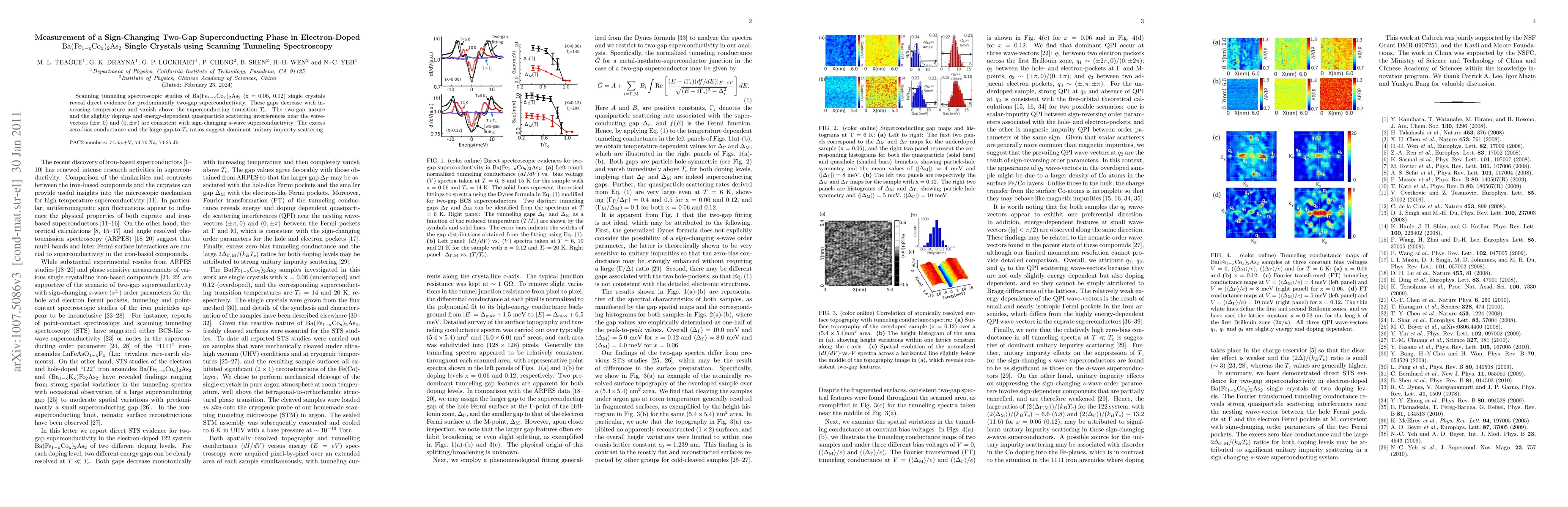 This study uses scanning tunneling spectroscopy to identify a sign-changing two-gap superconducting phase in electron-doped Ba(Fe_{1-x}Co_x)_2As_2 crystals, with the gaps diminishing and vanishing above $T_c$. The findings suggest $s$-wave superconductivity with unitary impurity scattering.