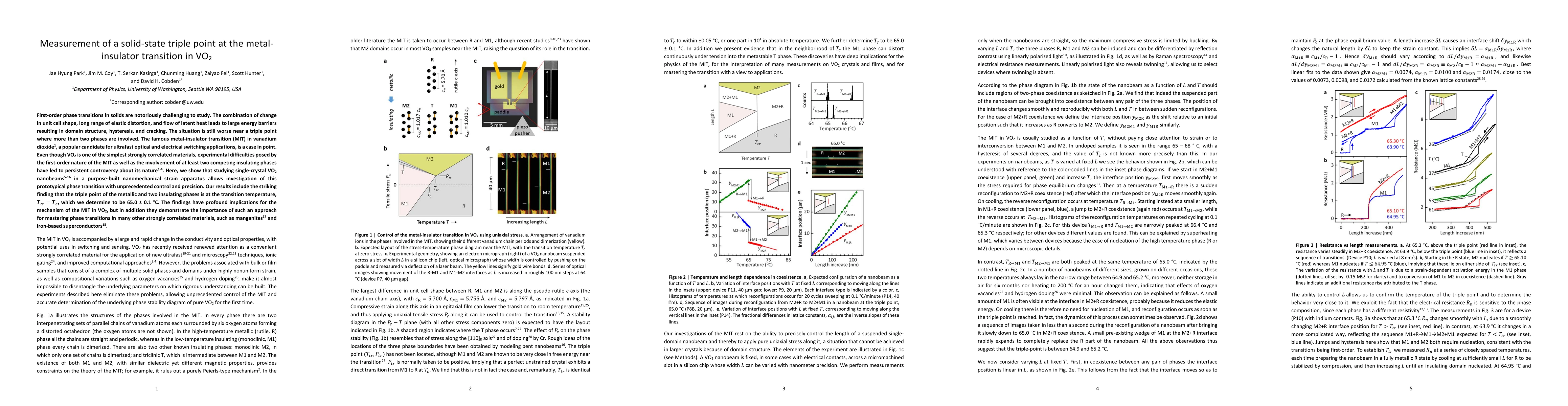 First-order phase transitions in solids are notoriously challenging to study. The combination of change in unit cell shape, long range of elastic distortion, and flow of latent heat leads to large energy barriers resulting in domain structure, hysteresis, and cracking. The situation is still worse near a triple point where more than two phases are involved. The famous metal-insulator transition (MIT) in vanadium dioxide, a popular candidate for ultrafast optical and electrical switching applications, is a case in point. Even though VO2 is one of the simplest strongly correlated materials, experimental difficulties posed by the first-order nature of the MIT as well as the involvement of at least two competing insulating phases have led to persistent controversy about its nature. Here, we show that studying single-crystal VO2 nanobeams in a purpose-built nanomechanical strain apparatus allows investigation of this prototypical phase transition with unprecedented control and precision. Our results include the striking finding that the triple point of the metallic and two insulating phases is at the transition temperature, T_tr = T_c, which we determine to be 65.0 +- 0.1 C. The findings have profound implications for the mechanism of the MIT in VO2, but in addition they demonstrate the importance of such an approach for mastering phase transitions in many other strongly correlated materials, such as manganites and iron-based superconductors.