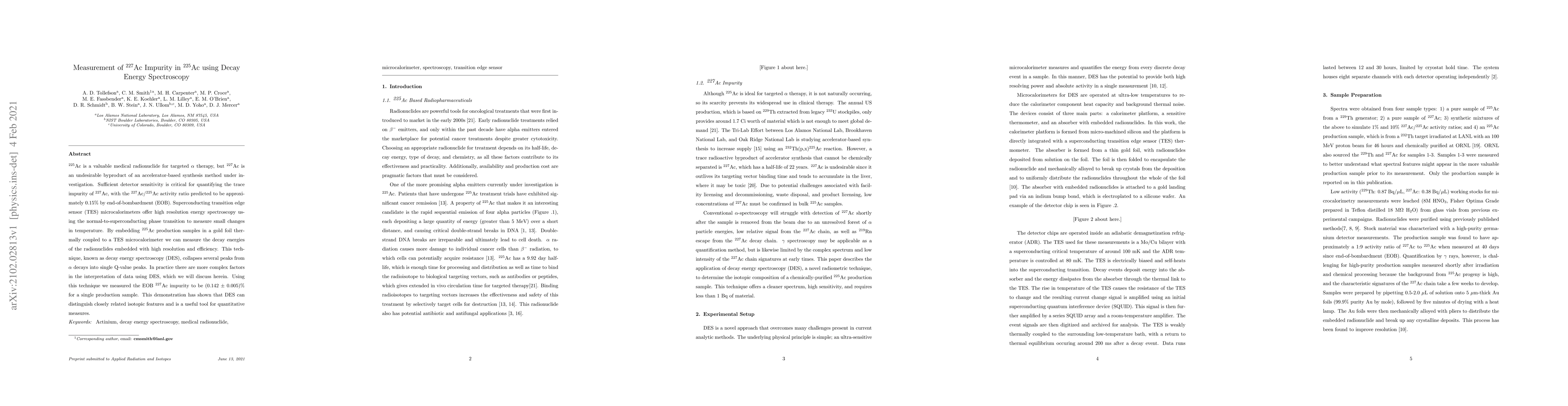 This paper presents a method using decay energy spectroscopy (DES) to measure the impurity of 227Ac in 225Ac, a critical task for targeted alpha therapy. The DES technique, employing superconducting transition edge sensor microcalorimeters, successfully quantified the 227Ac/225Ac activity ratio at 0.142 +/- 0.005%, demonstrating its potential for precise isotopic analysis.