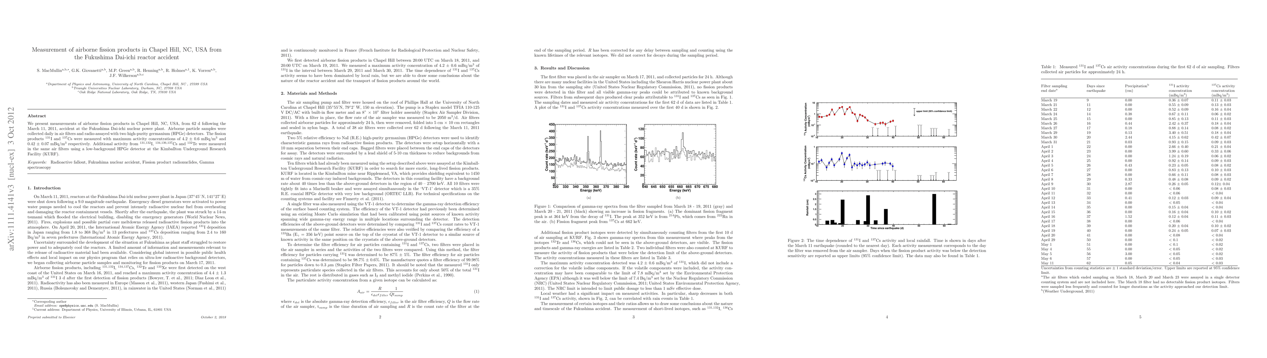 This study measures airborne fission products in Chapel Hill, NC, following the Fukushima Dai-ichi nuclear accident, finding maximum activities of 4.2 ± 0.6 mBq/m³ for I-131 and 0.42 ± 0.07 mBq/m³ for Cs-137. Additional isotopes were detected using a low-background HPGe detector at KURF.