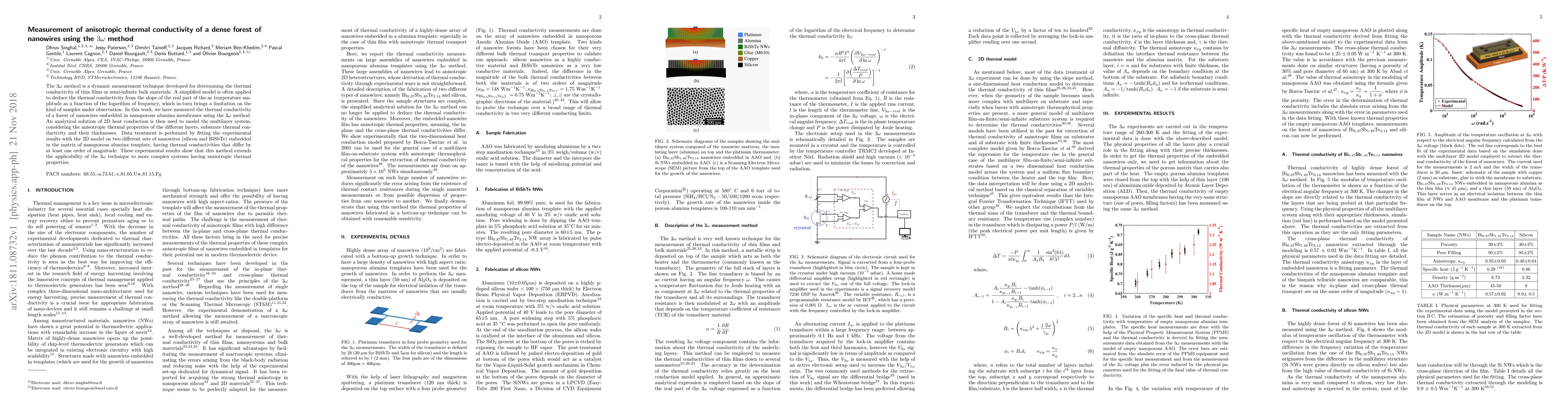 This paper measures the anisotropic thermal conductivity of nanowire forests using the 3$\omega$ method, demonstrating its applicability to complex systems. The study models the multilayer system with an analytical solution for 2D heat conduction, fitting experimental results for silicon and BiSbTe nanowires embedded in nanoporous alumina.