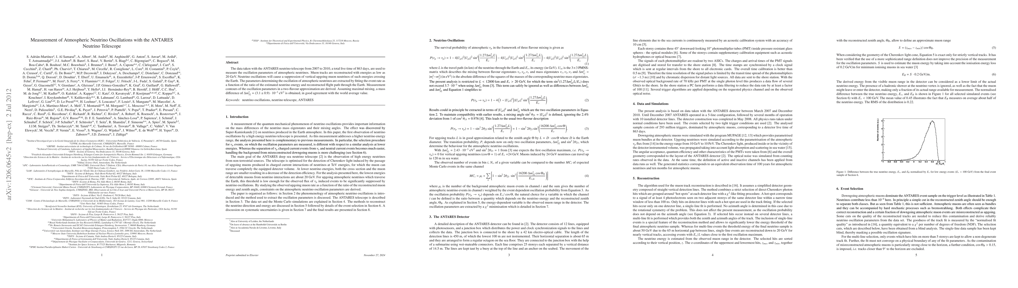 The ANTARES neutrino telescope measured atmospheric neutrino oscillations from 2007 to 2010, finding a mass difference $\Delta m_{32}^2=(3.1\pm 0.9)\cdot 10^{-3}$ eV$^2$ in good agreement with global average values, using muon track data from vertical upgoing neutrinos.
