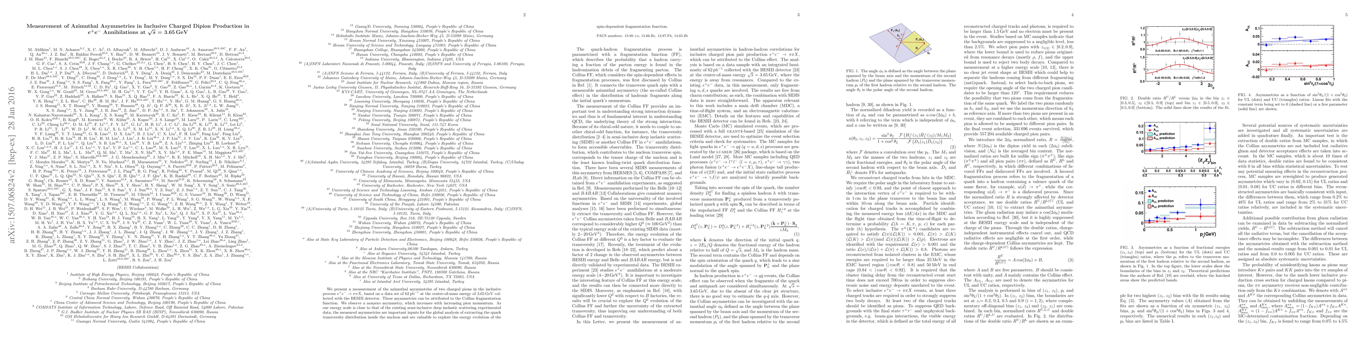 This study measures azimuthal asymmetries in inclusive charged dipion production from $e^+e^-$ annihilations at $\sqrt{s} = 3.65$ GeV, revealing a nonzero asymmetry linked to the Collins fragmentation function that increases with pion momentum. These findings are crucial for global analyses of the quark transversity distribution and the energy evolution of the spin-dependent fragmentation function.