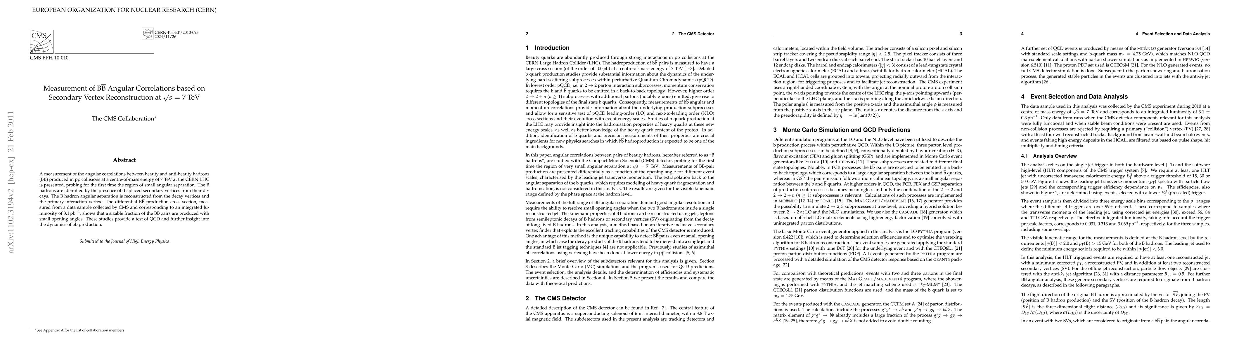 A measurement of the angular correlations between beauty and anti-beauty hadrons (B B-bar) produced in pp collisions at a centre-of-mass energy of 7 TeV at the CERN LHC is presented, probing for the first time the region of small angular separation. The B hadrons are identified by the presence of displaced secondary vertices from their decays. The B hadron angular separation is reconstructed from the decay vertices and the primary-interaction vertex. The differential B B-bar production cross section, measured from a data sample collected by CMS and corresponding to an integrated luminosity of 3.1 inverse picobarns, shows that a sizable fraction of the B B-bar pairs are produced with small opening angles. These studies provide a test of QCD and further insight into the dynamics of b b-bar production.