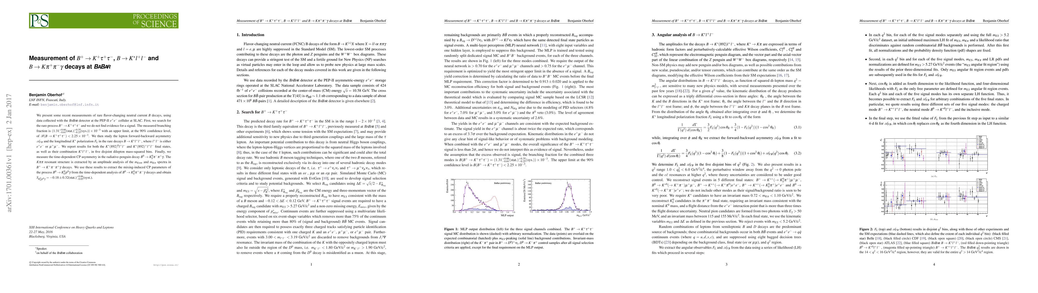 The research utilizes data from BABAR detector at PEP-II e+e- collider to study rare flavor-changing neutral current B decays, including B+ -> K+ tau- tau+, B -> K* l+ l-, and B -> K pi+ pi- gamma decays.