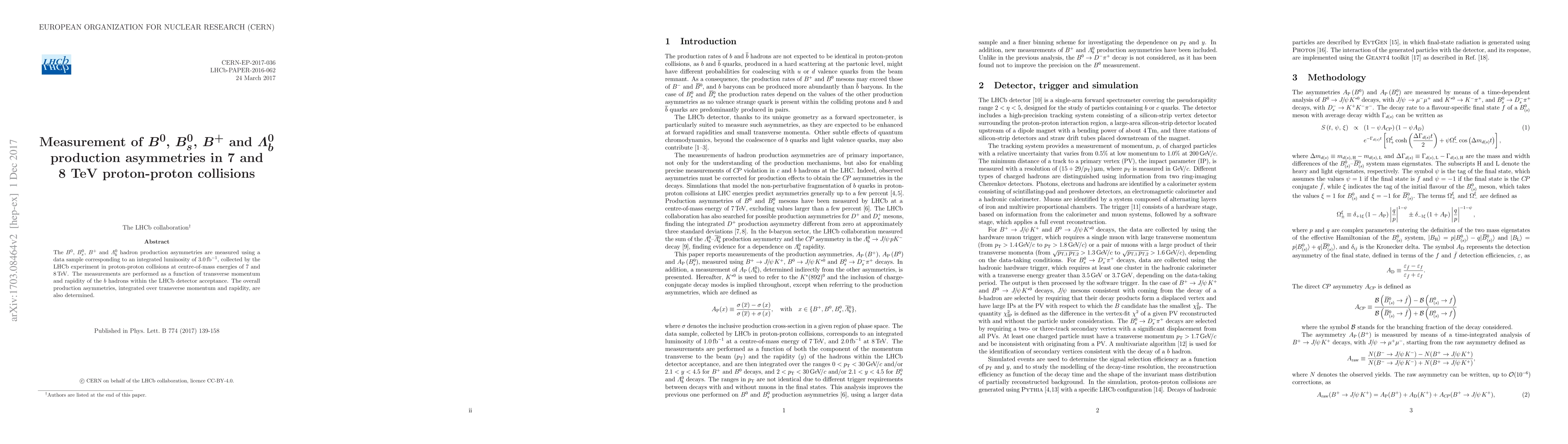 The $B^0$, $B^0_s$, $B^+$ and $\Lambda^0_b$ hadron production asymmetries are measured using a data sample corresponding to an integrated luminosity of 3.0 fb$^{-1}$, collected by the LHCb experiment in proton-proton collisions at centre-of-mass energies of 7 and 8 TeV. The measurements are performed as a function of transverse momentum and rapidity of the $b$ hadrons within the LHCb detector acceptance. The overall production asymmetries, integrated over transverse momentum and rapidity, are also determined.