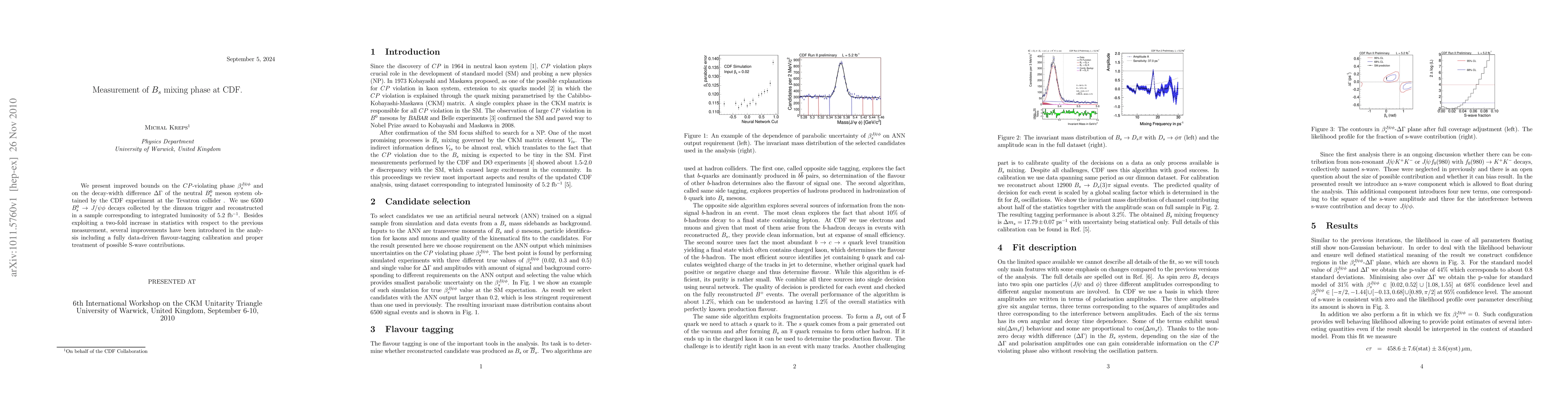 Researchers at CDF experiment improved bounds on the CP-violating phase and decay-width difference of the neutral B_s^0 meson system with 6500 B_s^0 -> J/psi phi decays, increasing statistics by two-fold.