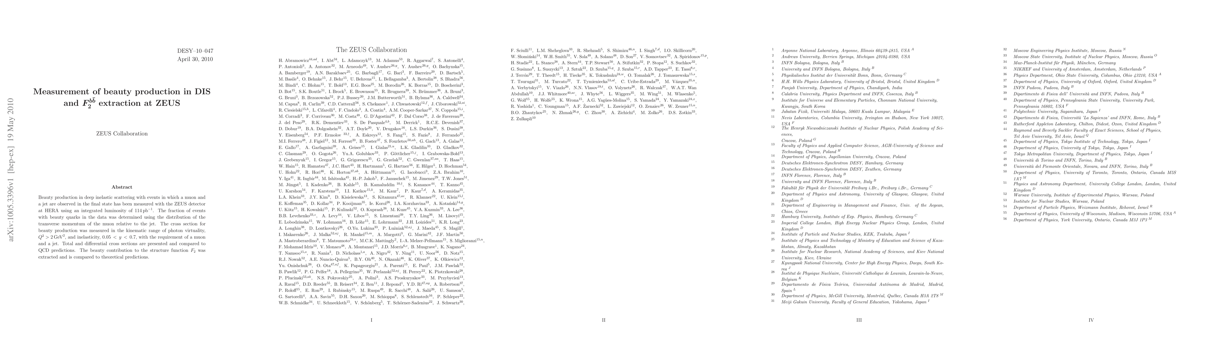 Researchers at ZEUS measured beauty production in deep inelastic scattering using HERA data, finding a cross section that differs from QCD predictions, and extracted the beauty contribution to structure function F_2.
