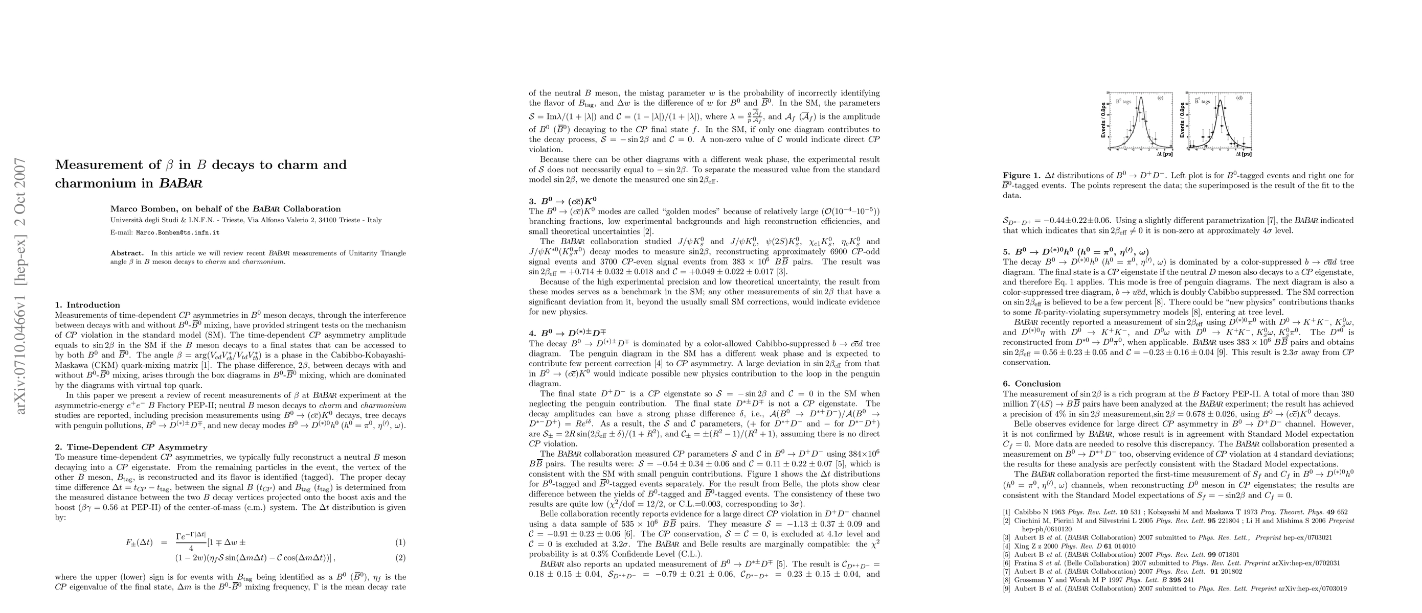 Summary: This paper reviews recent BABAR measurements of the Unitarity Triangle angle β in B meson decays involving charm and charmonium states, providing insights into the dynamics of weak interactions.