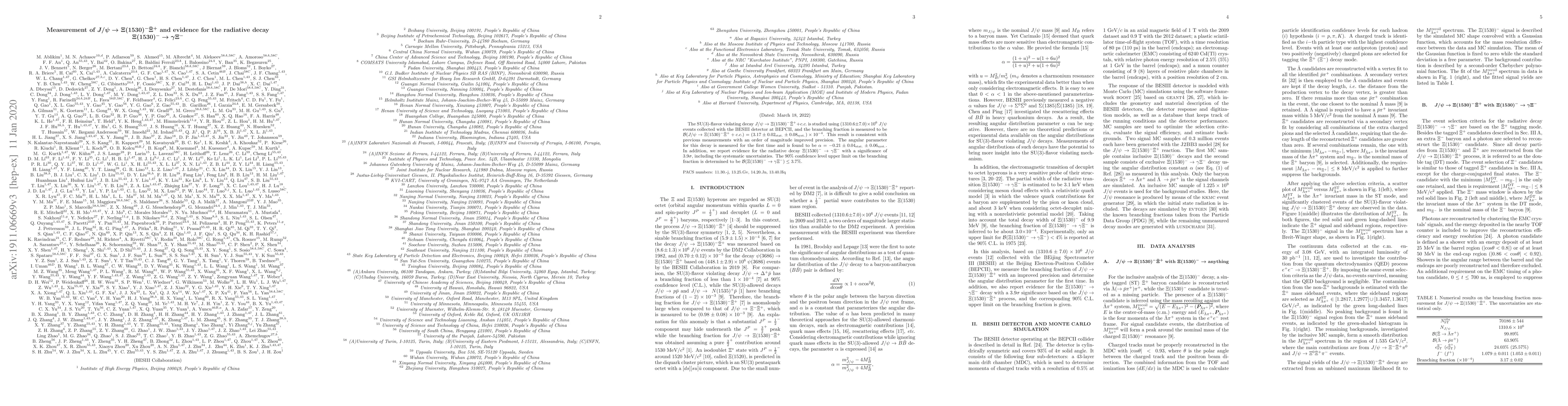 This study measures the SU(3)-flavor violating decay $J/\psi\to\Xi(1530)^{-}\bar\Xi^{+}$ with a branching fraction of $(3.17\pm0.02_{\rm stat.}\pm0.08_{\rm syst.})\times10^{-4}$, and reports evidence for the radiative decay $\Xi(1530)^{-}\to\gamma\Xi^-$ with a 3.9$\sigma$ significance.