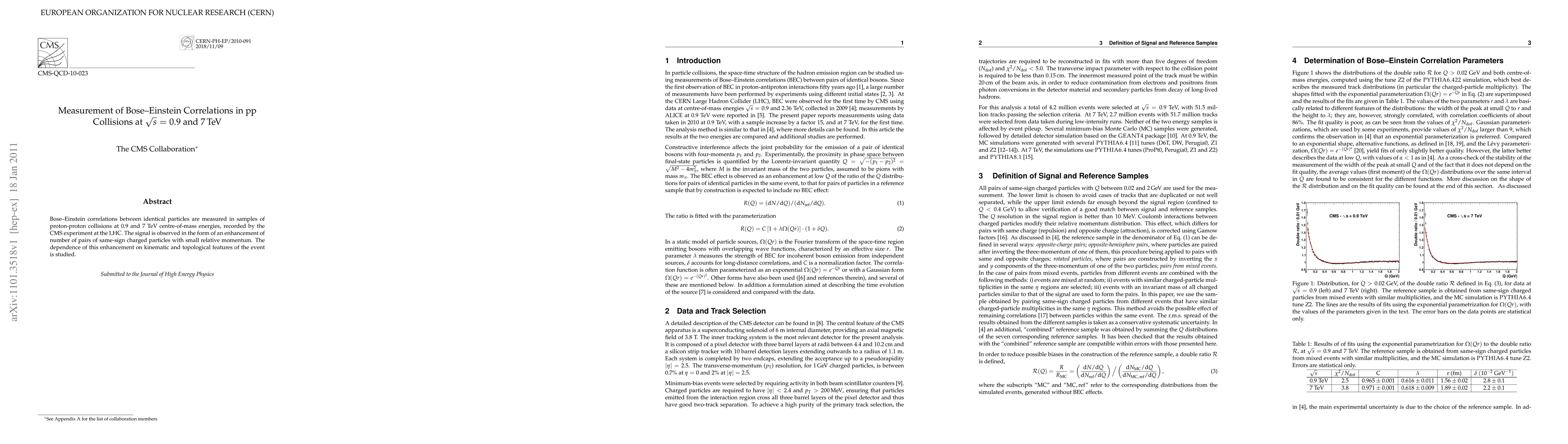 This paper measures Bose-Einstein correlations in proton-proton collisions at 0.9 and 7 TeV using the CMS experiment, observing an enhancement in same-sign charged particle pairs with small relative momentum, and analyzes the correlation's dependence on event kinematics and topology.