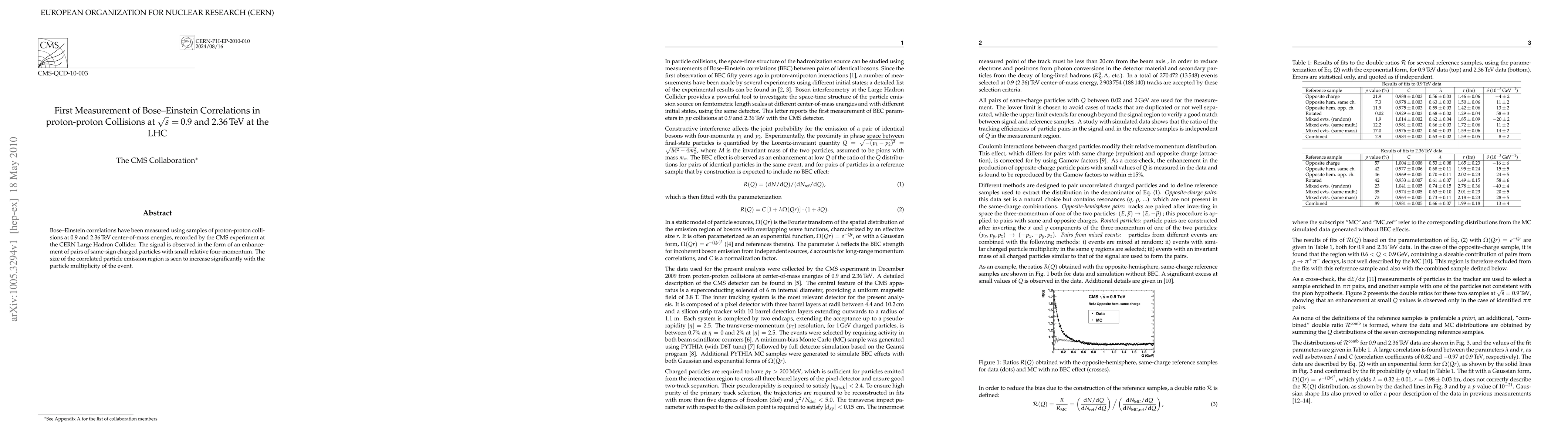 Bose-Einstein correlations have been measured using samples of proton-proton collisions at 0.9 and 2.36 TeV center-of-mass energies, recorded by the CMS experiment at the CERN Large Hadron Collider. The signal is observed in the form of an enhancement of pairs of same-sign charged particles with small relative four-momentum. The size of the correlated particle emission region is seen to increase significantly with the particle multiplicity of the event.