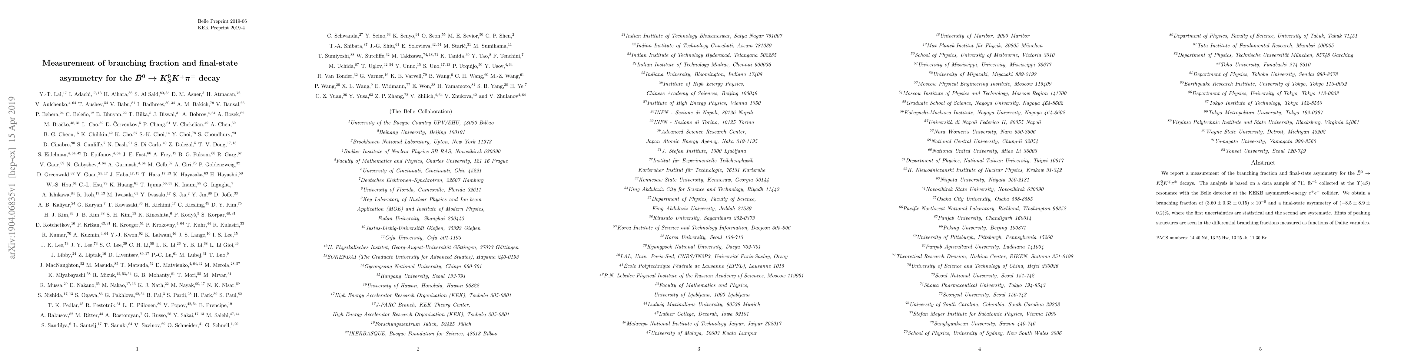 Researchers measured the branching fraction and final-state asymmetry for a specific type of B-meson decay, obtaining results with high precision and hinting at peaking structures in the data.