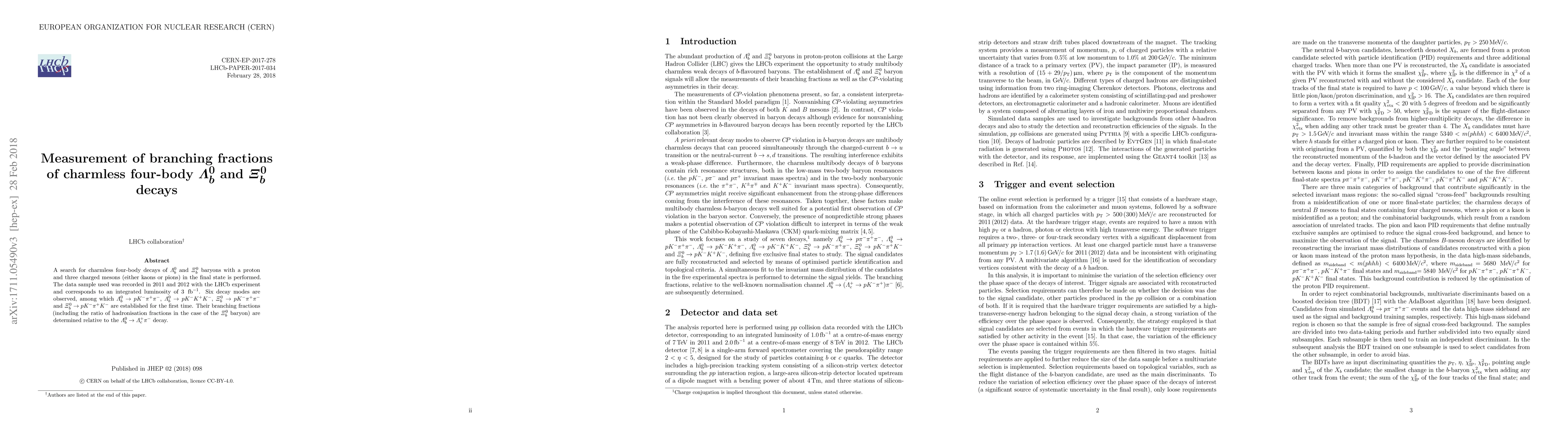 The LHCb experiment observed six charmless four-body decays of Λ_b^0 and Ξ_b^0 baryons, including first-time observations of Λ_b^0 → pK−π+π−, Λ_b^0 → pK+K−K−, Ξ_b^0 → pK−π+π−, and Ξ_b^0 → pK−π+K−. The branching fractions were determined relative to the Λ_b^0 → Λ_c+π− decay using a 3 fb^−1 data sample from 2011-2012.