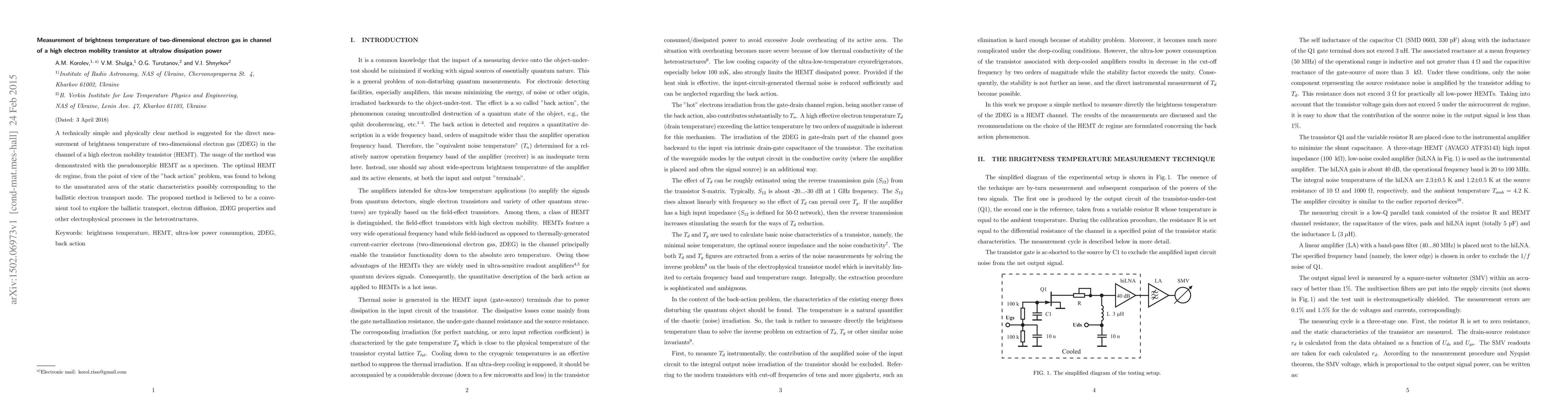 A technically simple and physically clear method is suggested for the direct measurement of brightness temperature of two-dimensional electron gas (2DEG) in the channel of a high electron mobility transistor (HEMT). The usage of the method was demonstrated with the pseudomorphic HEMT as a specimen. The optimal HEMT dc regime, from the point of view of the "back action" problem, was found to belong to the unsaturated area of the static characteristics possibly corresponding to the ballistic electron transport mode. The proposed method is believed to be a convenient tool to explore the ballistic transport, electron diffusion, 2DEG properties and other electrophysical processes in the heterostructures.