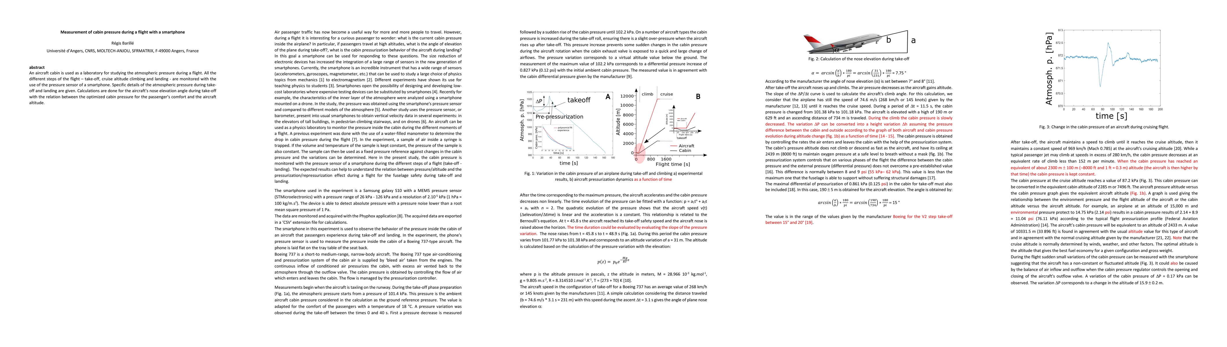 This study measures cabin pressure during various phases of a flight using a smartphone's pressure sensor, providing detailed insights into atmospheric pressure changes during take-off and landing, and correlating cabin pressure optimization with aircraft altitude.