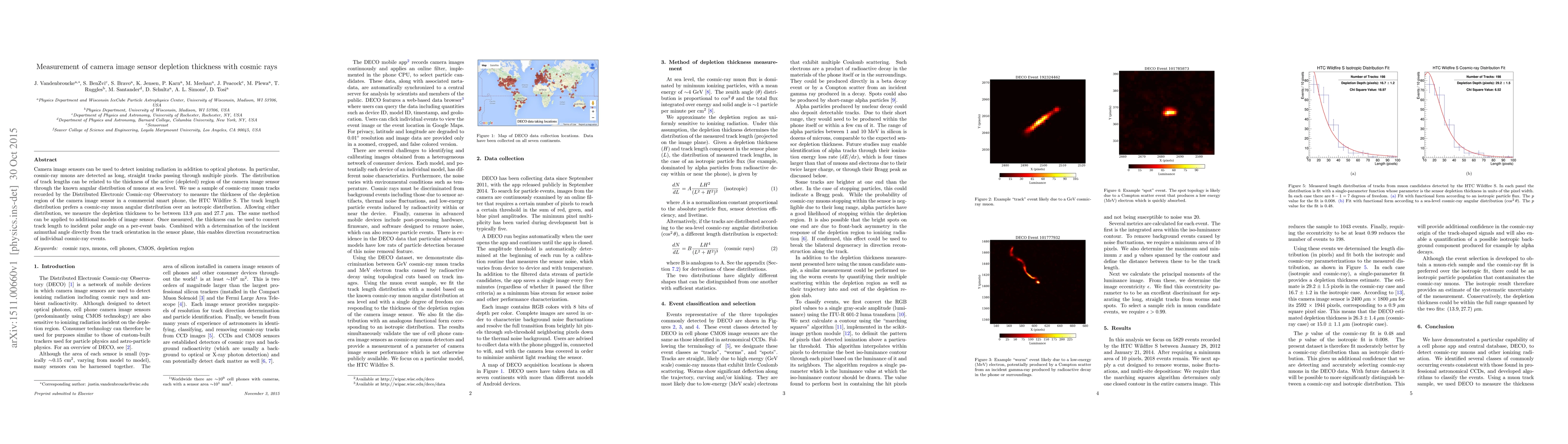 Camera image sensors can be used to detect ionizing radiation in addition to optical photons. In particular, cosmic-ray muons are detected as long, straight tracks passing through multiple pixels. The distribution of track lengths can be related to the thickness of the active (depleted) region of the camera image sensor through the known angular distribution of muons at sea level. We use a sample of cosmic-ray muon tracks recorded by the Distributed Electronic Cosmic-ray Observatory to measure the thickness of the depletion region of the camera image sensor in a commercial smart phone, the HTC Wildfire S. The track length distribution prefers a cosmic-ray muon angular distribution over an isotropic distribution. Allowing either distribution, we measure the depletion thickness to be between 13.9~$\mu$m and 27.7~$\mu$m. The same method can be applied to additional models of image sensor. Once measured, the thickness can be used to convert track length to incident polar angle on a per-event basis. Combined with a determination of the incident azimuthal angle directly from the track orientation in the sensor plane, this enables direction reconstruction of individual cosmic-ray events.