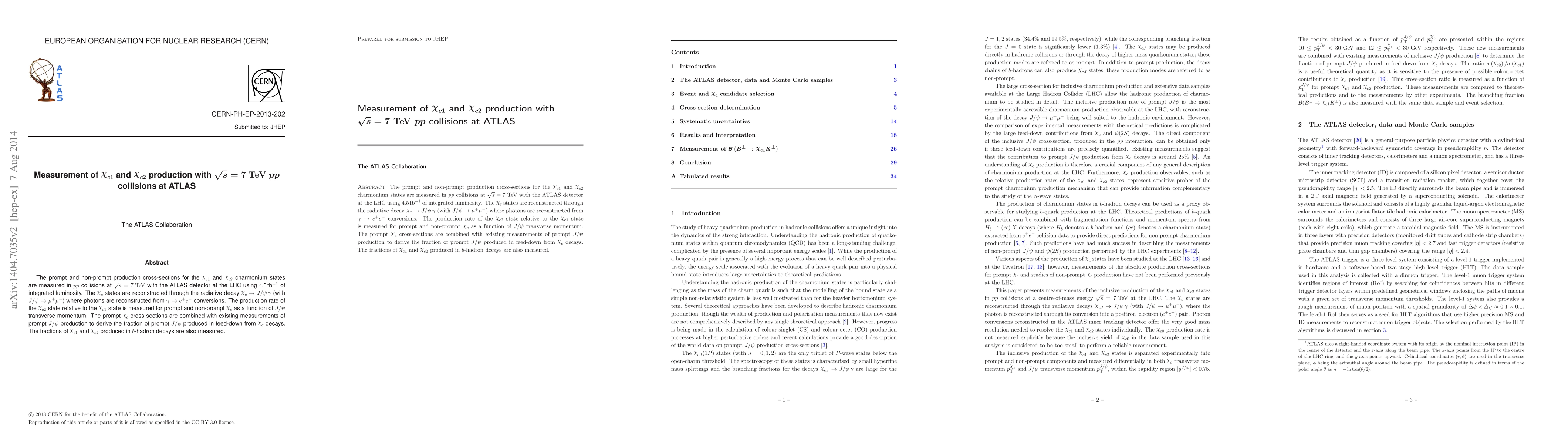 This study by ATLAS at LHC's 7 TeV pp collisions measures cross-sections for prompt and non-prompt chi_c1 and chi_c2 charmonium states' production. Utilizing 4.5 fb^-1 data, it finds the relative production rate of chi_c2 to chi_c1 for both prompt and non-prompt chi_c, as well as feed-down fractions from chi_c to J/psi and b-hadron decay fractions.