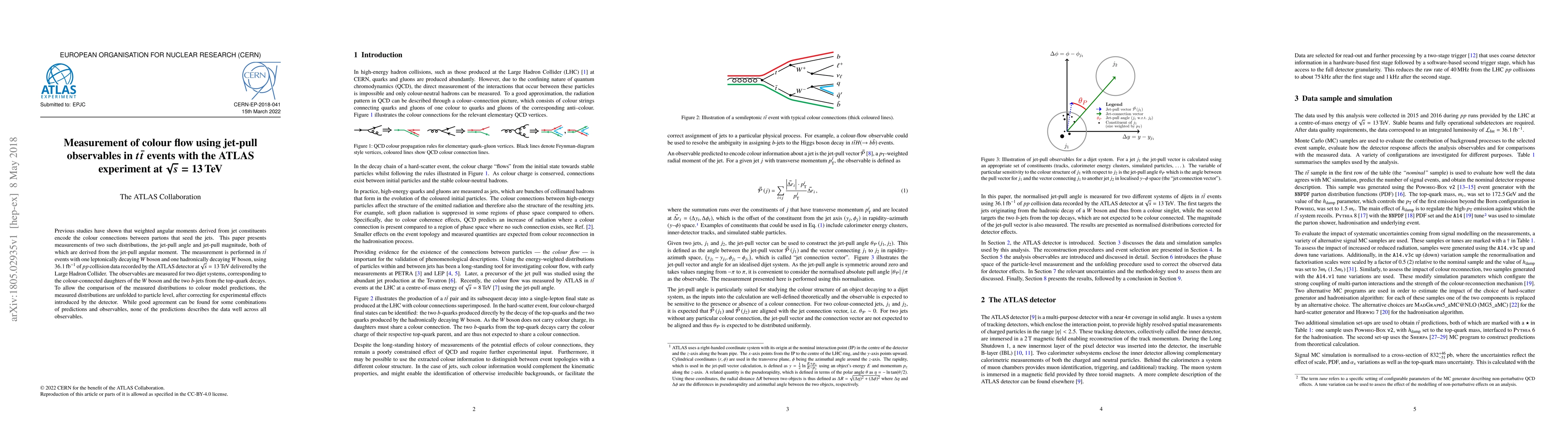 Researchers at ATLAS experiment measured colour flow in $tar{t}$ events using jet-pull observables, finding that none of current colour models describe the data well.