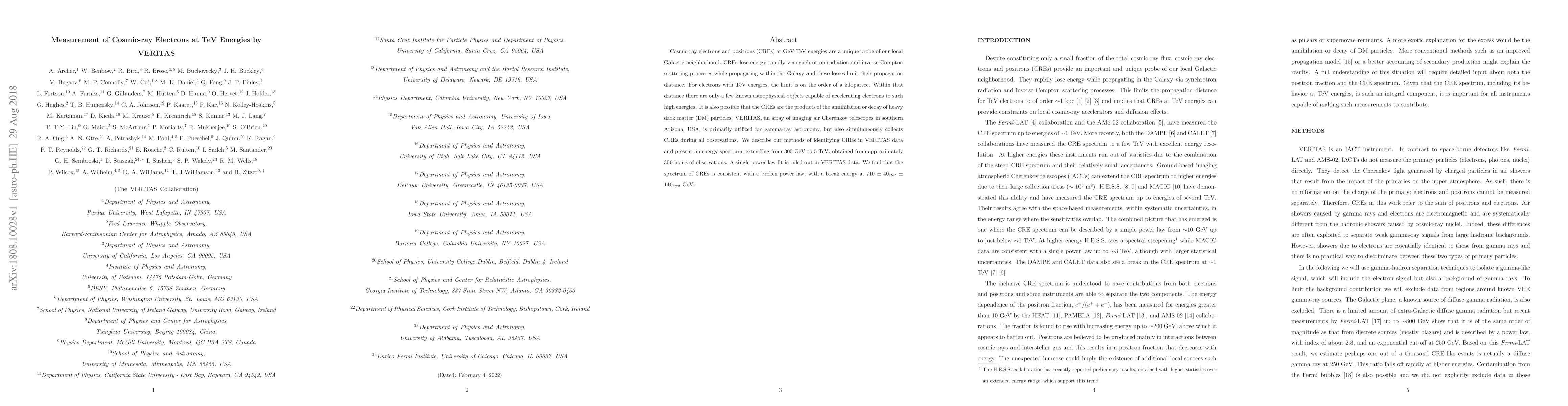 The VERITAS observatory measures cosmic-ray electrons (CREs) at TeV energies, revealing a spectrum from 300 GeV to 5 TeV that fits a broken power law with a break energy at 710 GeV, challenging the single power-law model. This data aids in understanding Galactic astrophysical sources and potential dark matter contributions.