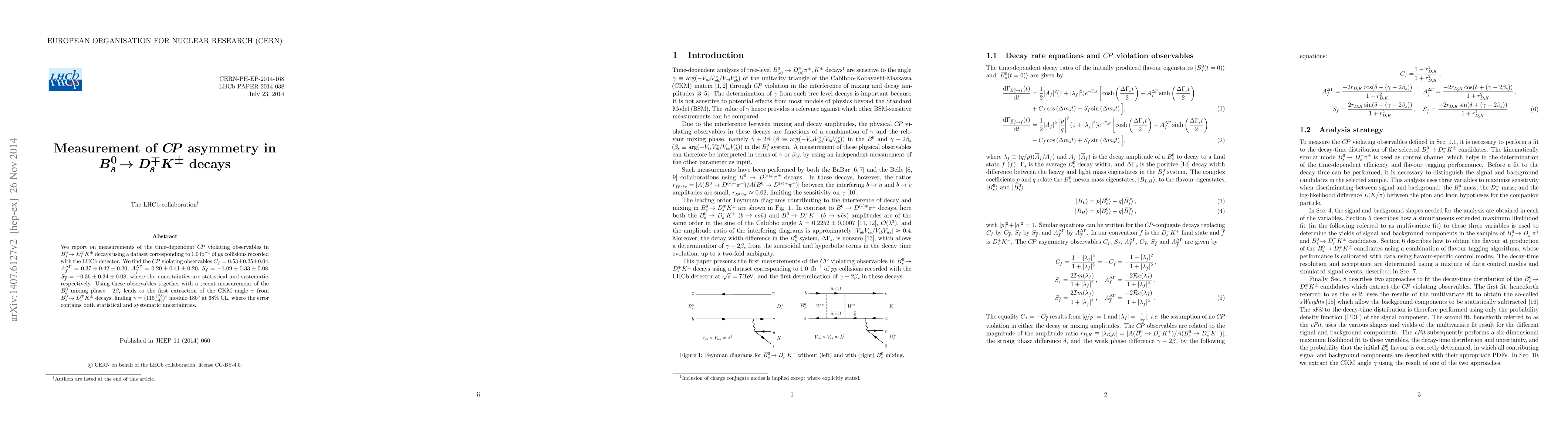 This study measures CP asymmetry in $B^0_s \rightarrow D^{\mp}_s K^{\pm}$ decays using LHCb data from 1.0 fb$^{-1}$ of pp collisions, reporting several CP violating observables. The first extraction of the CKM angle $\gamma$ from these decays yields $\gamma$ = (115$_{-43}^{+28}$)$^\circ$ modulo 180$^\circ$ at 68% CL.