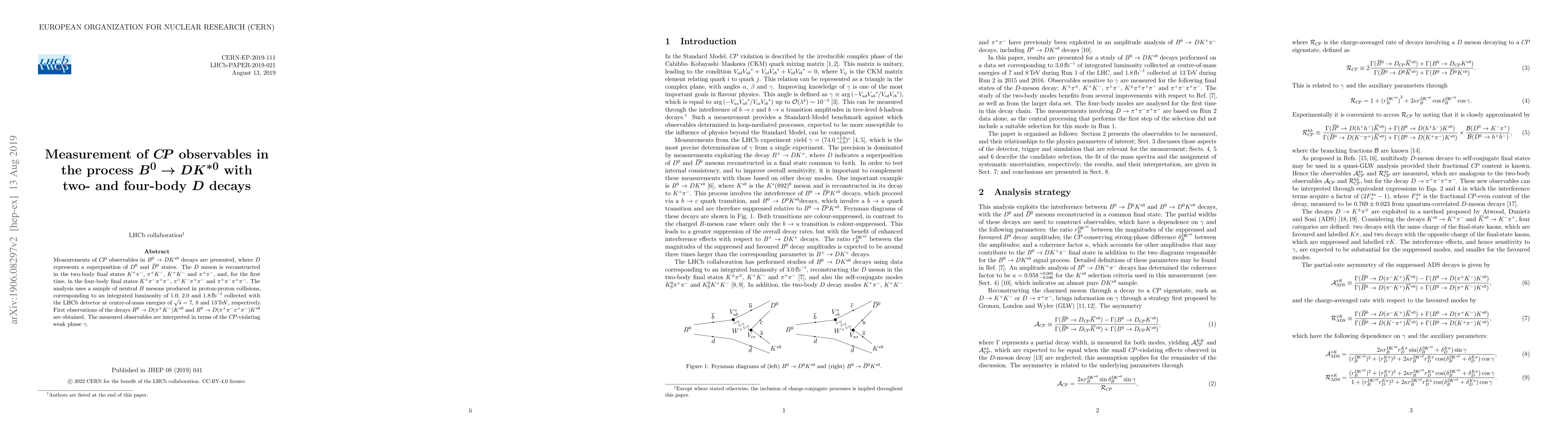Measurements of $C\!P$ observables in $B^0 \to DK^{*0}$ decays are presented, where $D$ represents a superposition of $D^0$ and $\bar{D}^0$ states. The $D$ meson is reconstructed in the two-body final states $K^+\pi^-$, $\pi^+ K^-$, $K^+K^-$ and $\pi^+\pi^-$, and, for the first time, in the four-body final states $K^+\pi^-\pi^+\pi^-$, $\pi^+ K^-\pi^+\pi^-$ and $\pi^+\pi^-\pi^+\pi^-$. The analysis uses a sample of neutral $B$ mesons produced in proton-proton collisions, corresponding to an integrated luminosity of 1.0, 2.0 and 1.8 $\rm fb^{-1}$ collected with the LHCb detector at centre-of-mass energies of $\sqrt{s} = $ 7, 8 and 13 TeV, respectively. First observations of the decays $B^0 \to D(\pi^+ K^-)K^{*0}$ and $B^0 \to D(\pi^+\pi^-\pi^+\pi^-)K^{*0}$ are obtained. The measured observables are interpreted in terms of the $C\!P$-violating weak phase $\gamma$.