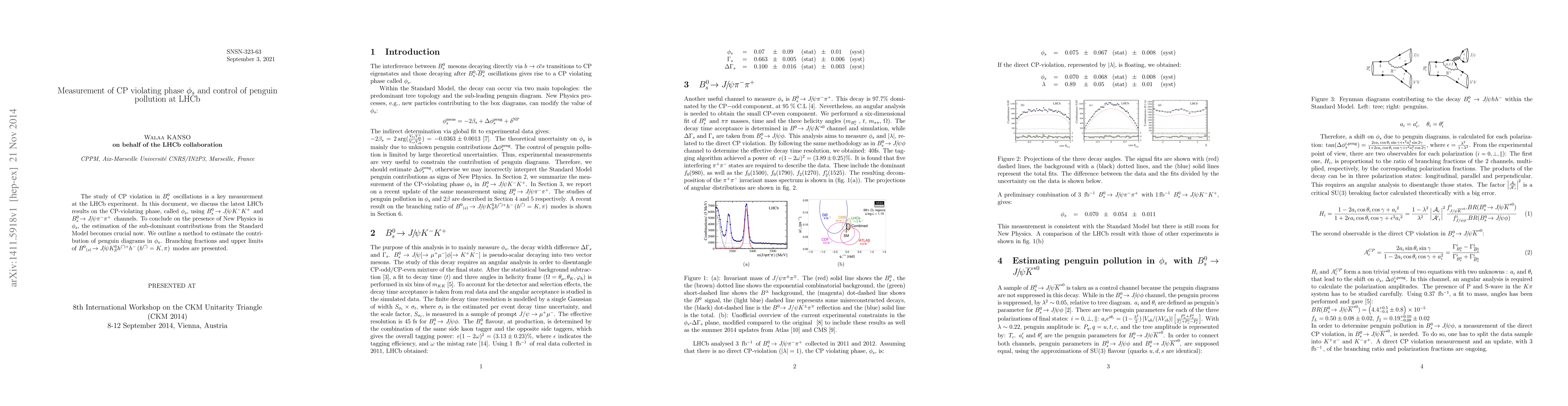 This paper reports LHCb's latest findings on the CP-violating phase $\phi_s$ in \Bs\ oscillations, using \BsJKK\ and \BsJpipi\ channels. The study also outlines a method to estimate penguin diagram contributions, crucial for assessing potential New Physics influences.
