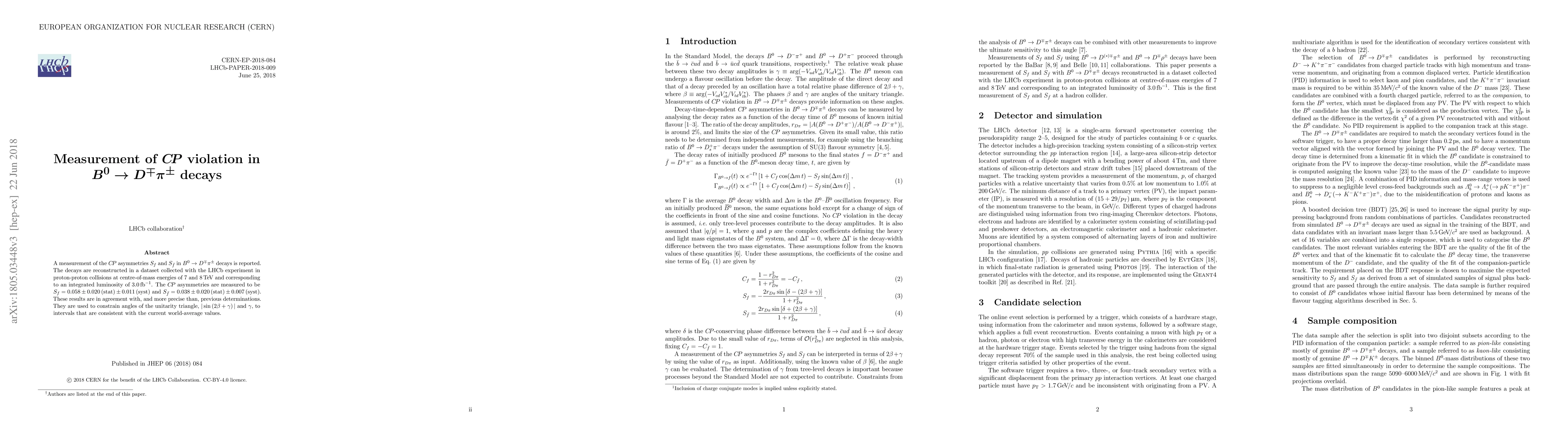 A measurement of the $CP$ asymmetries $S_{f}$ and $S_{\bar{f}}$ in $B^0\to D^{\mp}\pi^{\pm}$ decays is reported. The decays are reconstructed in a dataset collected with the LHCb experiment in proton-proton collisions at centre-of-mass energies of 7 and 8 TeV and corresponding to an integrated luminosity of $3.0 \rm{ fb}^{-1}$. The $CP$ asymmetries are measured to be $S_{f} = 0.058 \pm 0.020 (\rm{stat}) \pm 0.011(\rm{syst})$ and $S_{\bar{f}} = 0.038\pm 0.020 (\text{stat})\pm 0.007 (\text{syst})$. These results are in agreement with, and more precise than, previous determinations. They are used to constrain $|\sin\left(2\beta+\gamma\right)|$ and $\gamma$ to intervals that are consistent with the current world-average values.
