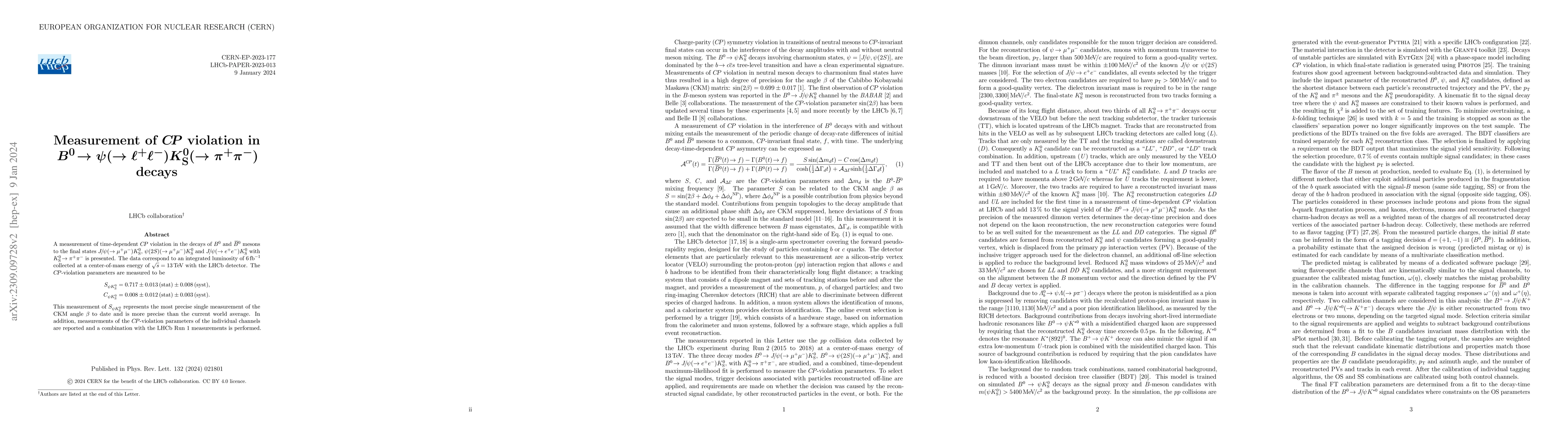 This paper presents a precise measurement of time-dependent CP violation in $B^0$ meson decays to $J/\psi K^0_S$ final states, yielding $S_{\psi K^0_S} = 0.717 \pm 0.013 (\text{stat}) \pm 0.008 (\text{syst})$, the most accurate single measurement of the CKM angle $\beta$ to date. The study also reports individual channel CP-violation parameters and combines results with previous LHCb measurements.