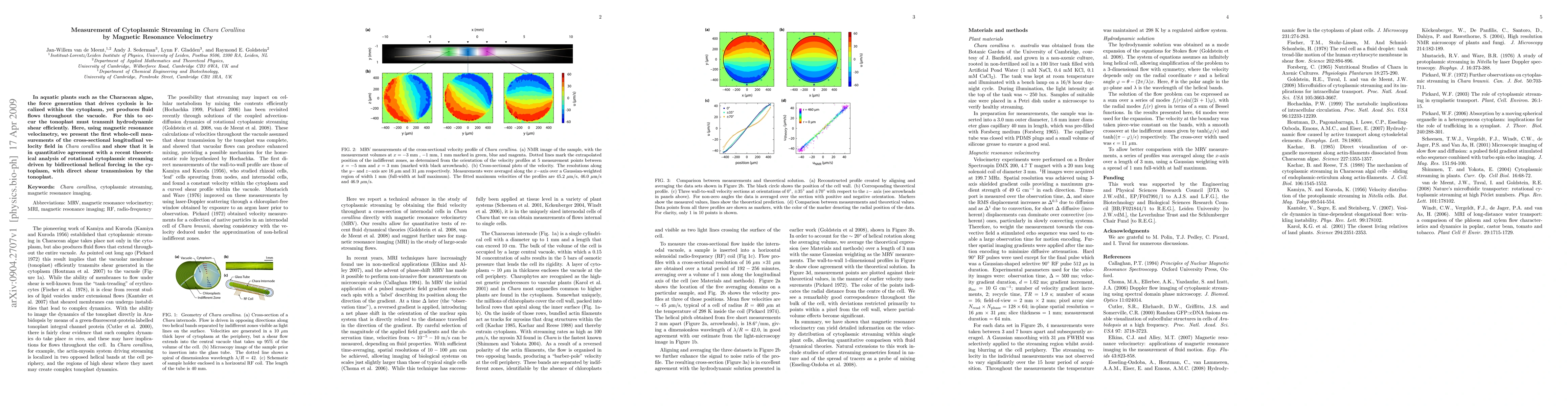 This research uses magnetic resonance velocimetry to measure cytoplasmic streaming in Chara corallina, confirming theoretical predictions of bidirectional helical forcing driving fluid flows via efficient shear transmission by the tonoplast.