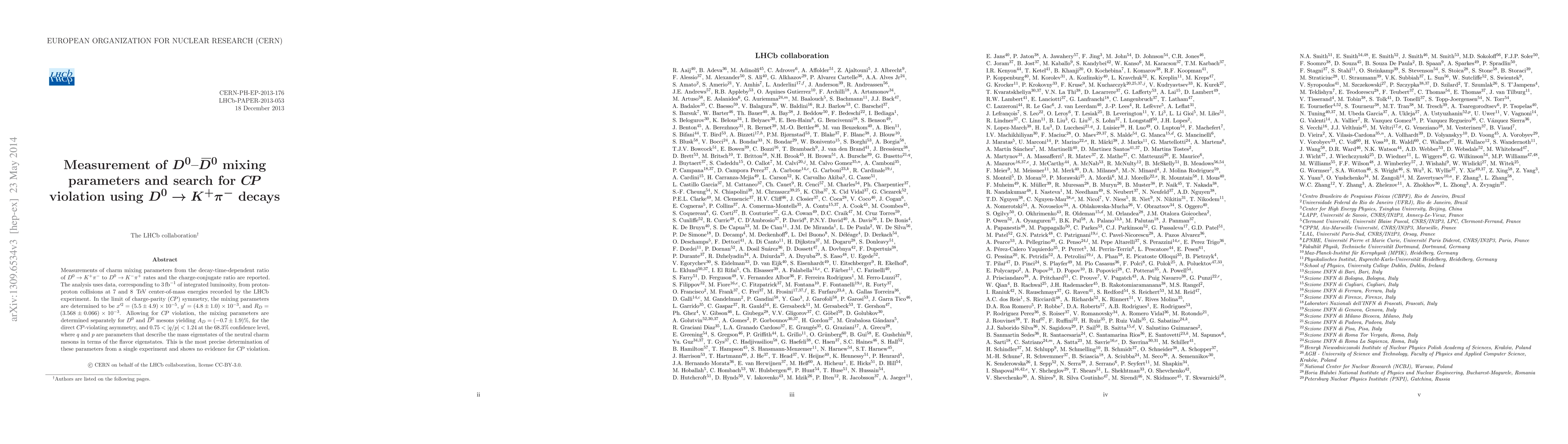 Measurements of charm mixing parameters from the decay-time-dependent ratio of D0->K+pi- to D0->K-pi+ rates and the charge-conjugate ratio are reported. The analysis uses data, corresponding to 3 fb^{-1} of integrated luminosity, from proton-proton collisions at 7 and 8 TeV center-of-mass energies recorded by the LHCb experiment. In the limit of charge-parity (CP) symmetry, the mixing parameters are determined to be x'^2=(5.5 +- 4.9)x10^{-5}, y'= (4.8 +- 1.0)x10^{-3}, and R_D=(3.568 +- 0.066)x10^{-3}. Allowing for CP violation, the mixing parameters are determined separately for D0 and D0bar mesons yielding A_D = (-0.7 +- 1.9)%, for the direct CP-violating asymmetry, and 0.75 < |q/p|< 1.24 at the 68.3% confidence level, where q and p are parameters that describe the mass eigenstates of the neutral charm mesons in terms of the flavor eigenstates. This is the most precise determination of these parameters from a single experiment and shows no evidence for CP violation.