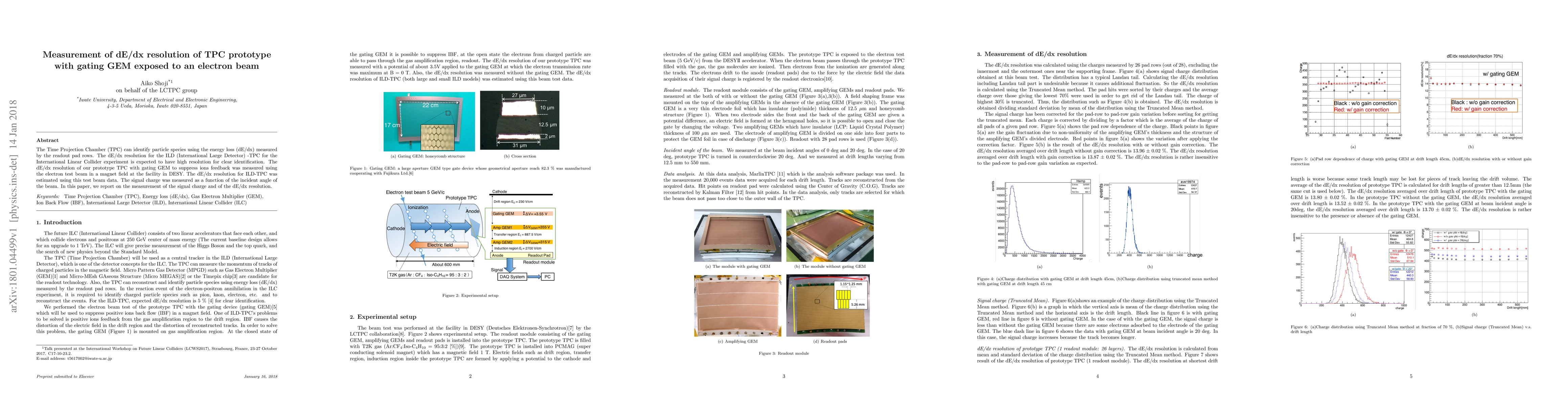 The Time Projection Chamber (TPC) can identify particle species using the energy loss (dE/dx) measured by the readout pad rows. The dE/dx resolution for the ILD (International Large Detector) -TPC for the International Linear Collider experiment is expected to have high resolution for clear identification. The dE/dx resolution of our prototype TPC with gating device (gating GEM) to suppress ions feedback was measured using the electron test beam in a magnet field at the facility in DESY. The dE/dx resolution for ILD-TPC was estimated using this test beam data. The signal charge was measured as a function of the incident angle of the beam. In this paper, we report on the measurement of the signal charge and of the dE/dx resolution.