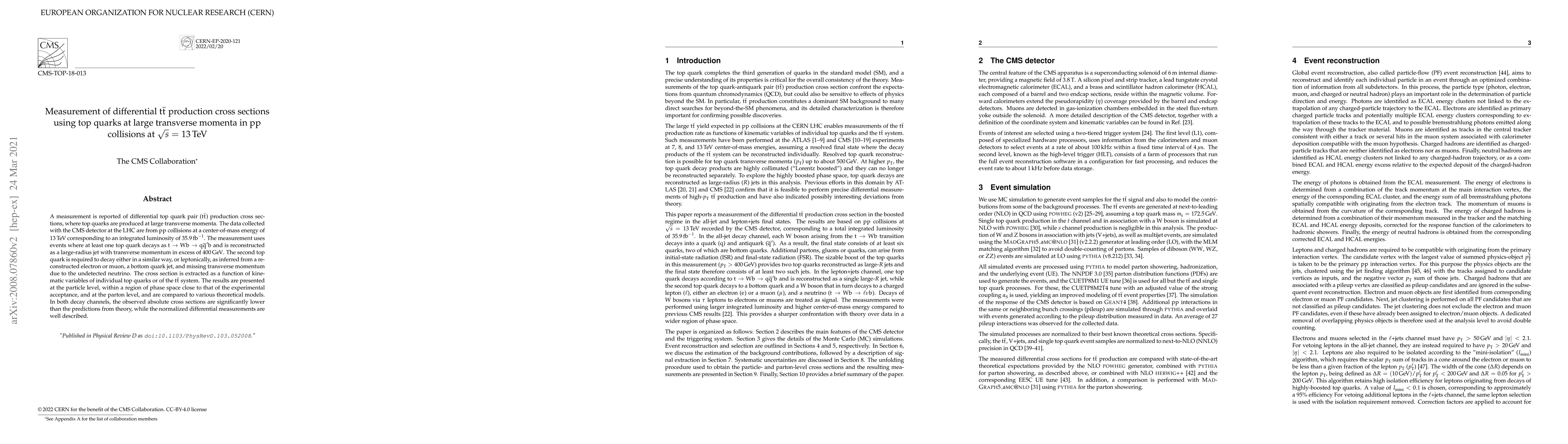 This paper reports a measurement of differential $\mathrm{t\bar{t}}$ production cross sections using the CMS detector at the LHC, focusing on top quarks with large transverse momenta in 13 TeV pp collisions. The observed absolute cross sections are lower than theoretical predictions, though differential measurements align well.