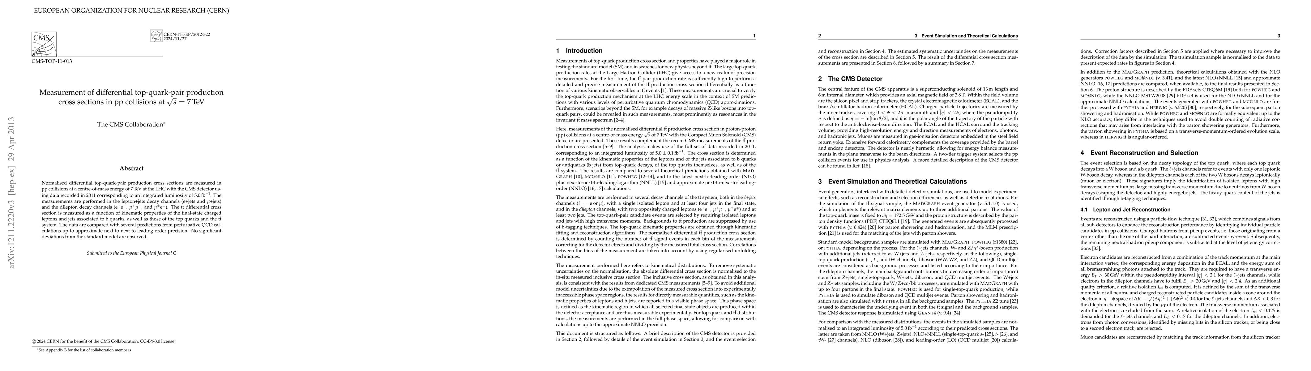 Scientists at CMS measured top-quark pair production cross sections in 7 TeV collisions with minimal deviations from standard model predictions.