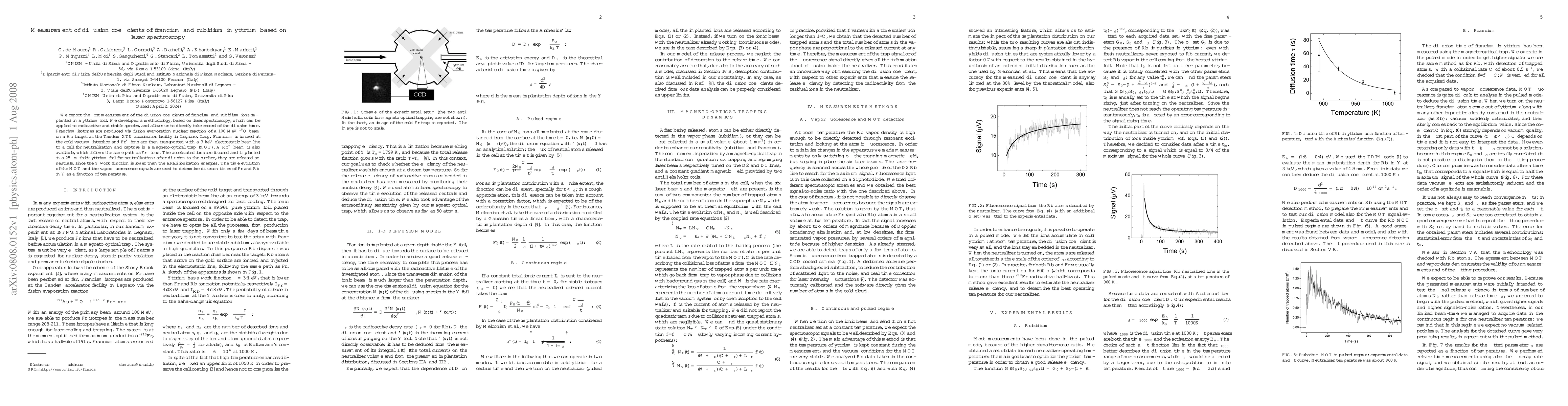 We report the first measurement of the diffusion coefficients of francium and rubidium ions implanted in a yttrium foil. We developed a methodology, based on laser spectroscopy, which can be applied to radioactive and stable species, and allows us to directly take record of the diffusion time. Francium isotopes are produced via fusion-evaporation nuclear reaction of a 100 MeV 18-O beam on a Au target at the Tandem XTU accelerator facility in Legnaro, Italy. Francium is ionized at the gold-vacuum interface and Fr+ ions are then transported with a 3 keV electrostatic beamline to a cell for neutralization and capture in a magneto-optical trap (MOT). A Rb+ beam is also available, which follows the same path as Fr+ ions. The accelerated ions are focused and implanted in a 25 um thick yttrium foil for neutralization: after diffusion to the surface, they are released as neutrals, since the Y work function is lower than the alkali ionization energies. The time evolution of the MOT and the vapor fluorescence signals are used to determine diffusion times of Fr and Rb in Y as a function of temperature.
